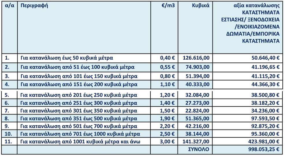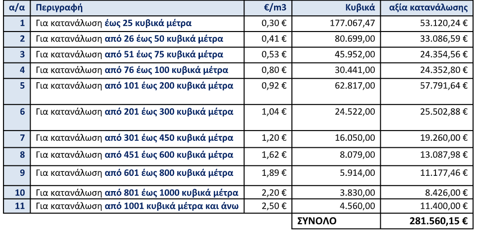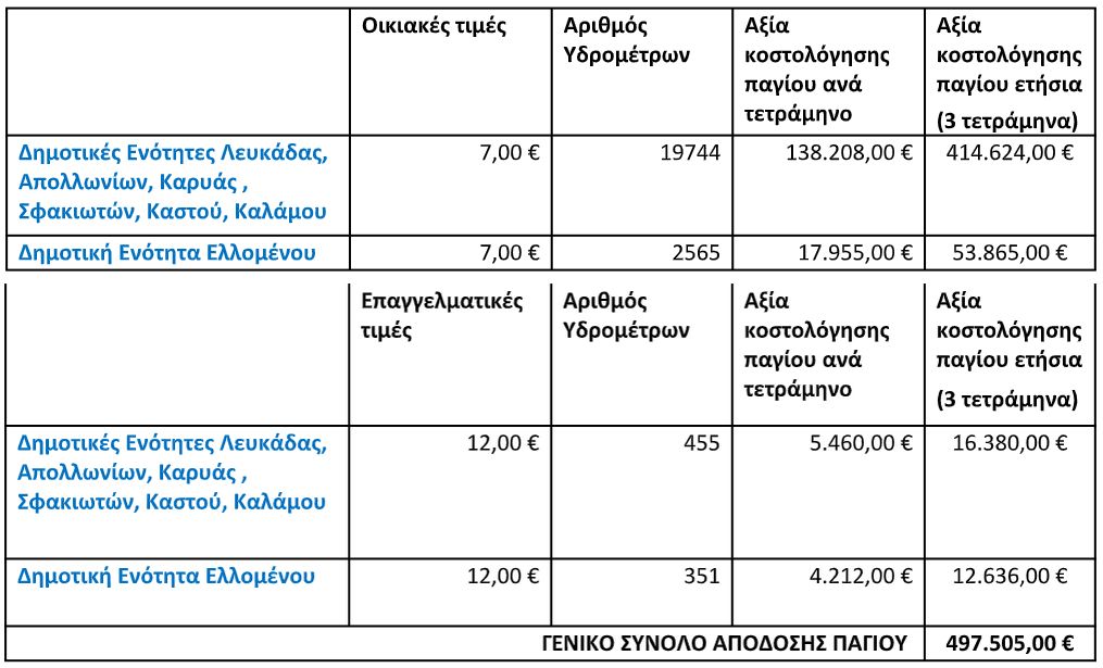 Η επιβολή των τελών ύδρευσης αποχέτευσης σε όλο το Δήμο γίνεται σε τετραμηνιαία βάση. Παραδείγματος χάριν για μία οικιακή κατανάλωση 49 κυβικών μέτρων στη Δημοτική Ενότητα Λευκάδας, σύμφωνα με ένα λογαριασμό που έχω στα χέρια μου, η αύξηση που προκύπτει με το νέο τιμοκατάλογο χωρίς να συνυπολογίζεται το πάγιο, που και αυτό αυξάνεται (στην προκειμένη περίπτωση από 6 σε 7 ευρώ) και ο ΦΠΑ, είναι της τάξης του 8% (από 49×0,44 = 21,56 € σε 25×0,40 = 10,00 € + 24×0,55 = 13.20 € – Σ: 23,2 €–> Αύξηση 8%).
