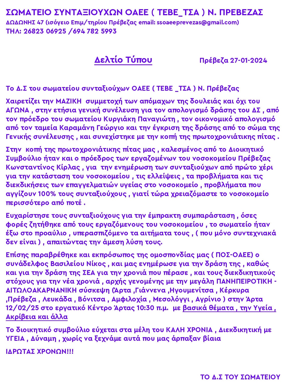 Τα μέλη του Δ.Σ του Σωματείου Παναγιώτης Κυργιάκης και Γιώργος Καραμάνης παρουσίασαν τον τακτικό και οικονομικό απολογισμό αντίστοιχα ενώ ακολούθησε η κοπή της πρωτοχρονιάτικης πίτας με καλεσμένο τον πρόεδρο του Δ.Σ Εργαζομένων του Νοσοκομείου Πρέβεζας Κώστα Κύρλα ο οποίος ενημέρωσε για τα προβλήματα και τις ελλείψεις στο ευαίσθητο χώρο της υγείας.