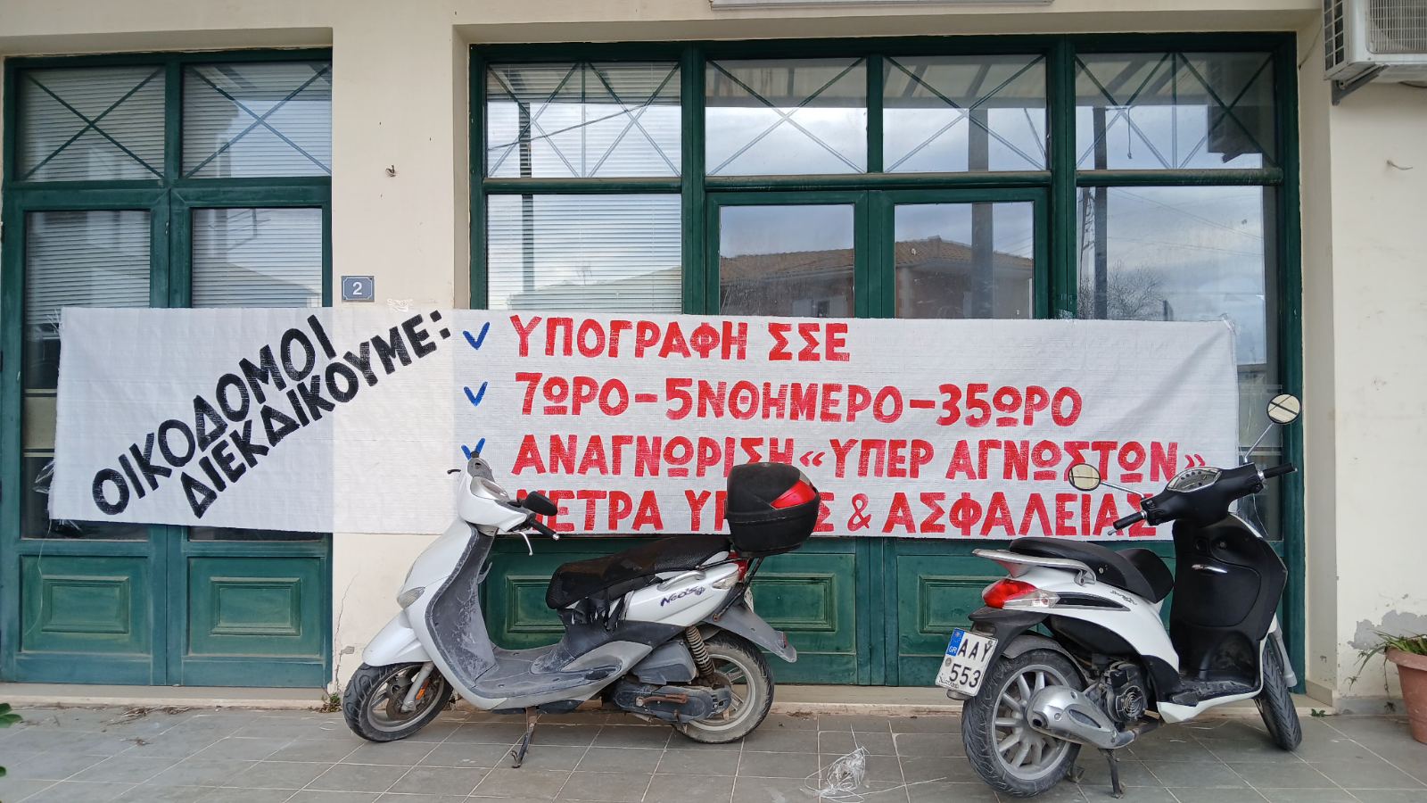 Οι οικοδόμοι απεργούν διεκδικώντας την υπογραφή νέας Συλλογικής Σύμβασης, τη διανομή των «υπέρ αγνώστων» ενσήμων, τα μέτρα υγείας και ασφάλειας στους χώρους.