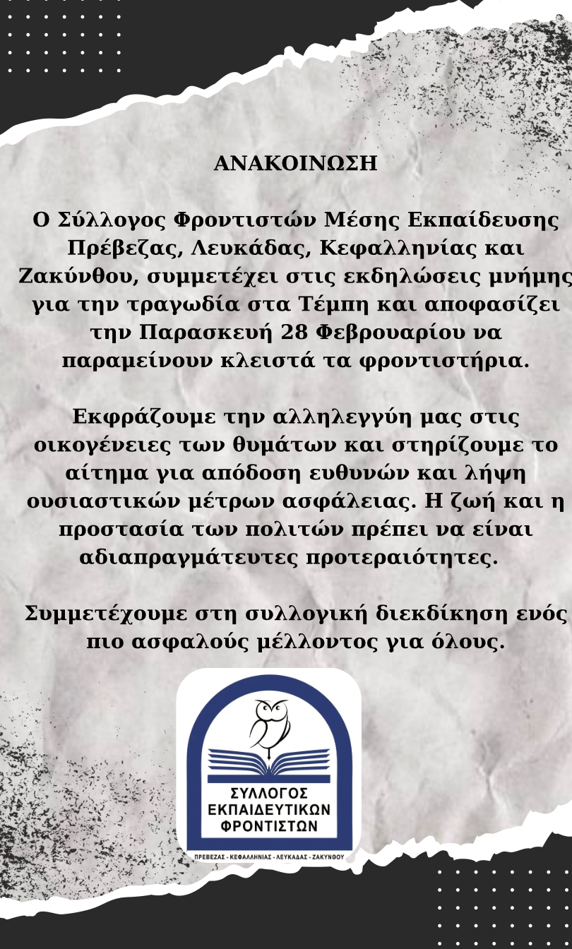 Ο Σύλλογος Φροντιστών Μέσης Εκπαίδευσης Πρέβεζας, Λευκάδας, Κεφαλληνίας και Ζακύνθου, συμμετέχει στις εκδηλώσεις μνήμης για την τραγωδία στα Τέμπη και αποφασίζει την Παρασκευή 28 Φεβρουαρίου να παραμείνουν κλειστά τα φροντιστήρια.