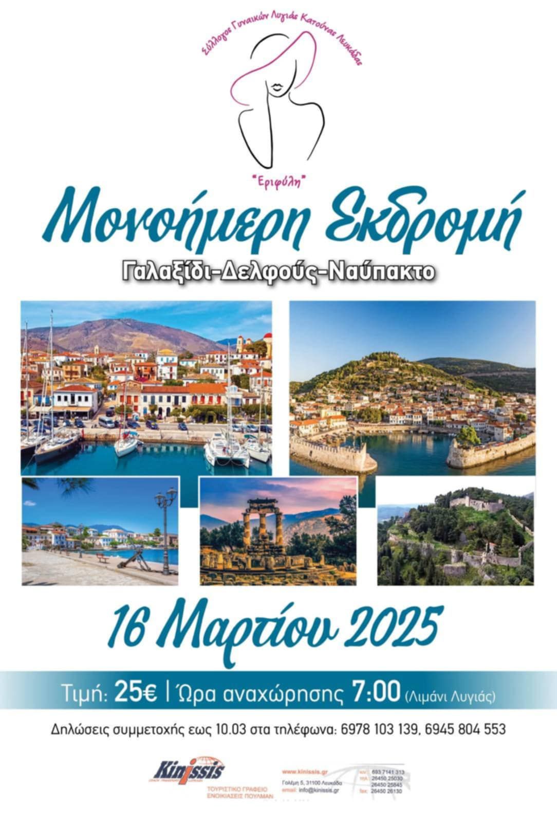 Μονοήμερη εκδρομή σε Γαλαξείδι, Δελφούς και Ναύπακτο διοργανώνει στις 16 Μαρτίου 2025 ο Σύλλογος Γυναικών Λυγιάς – Κατούνας Λευκάδας «Εριφύλη».