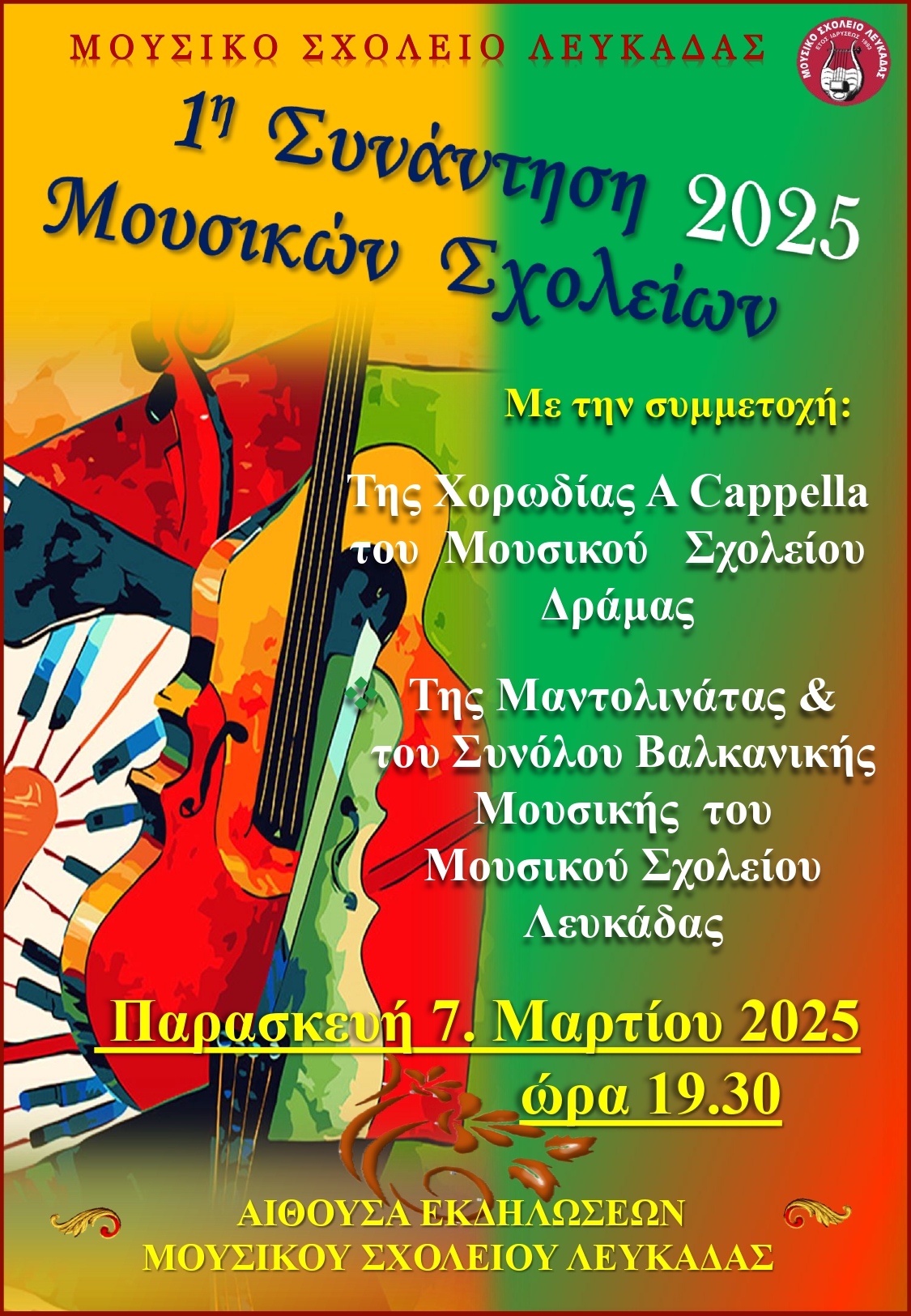 Το Μουσικό Σχολείο Λευκάδας σας προσκαλεί στη μαθητική συναυλία, που θα πραγματοποιηθεί στην αίθουσα εκδηλώσεων του Σχολείου, την Παρασκευή 7 Μαρτίου στις 19.30, στο πλαίσιο της 1ης Συνάντησης των Μουσικών Σχολείων 2025.