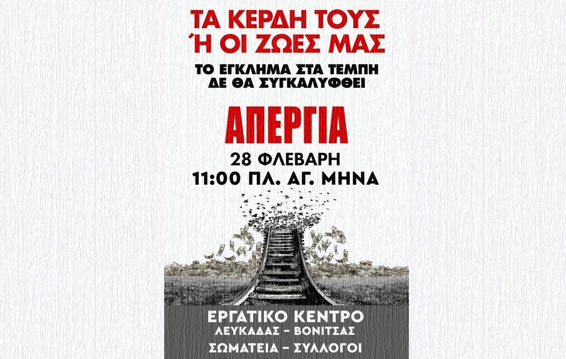 Με κεντρικό σύνθημα «Τα κέρδη τους ή οι ζωές μας» τα συνδικάτα απεργούν για να μη συγκαλυφθεί το έγκλημα, για να αποκαλυφθούν οι αιτίες που οδήγησαν εκεί, γιατί δεν μπορεί η ζωή των εργαζομένων και των ανθρώπων να είναι «κόστος».