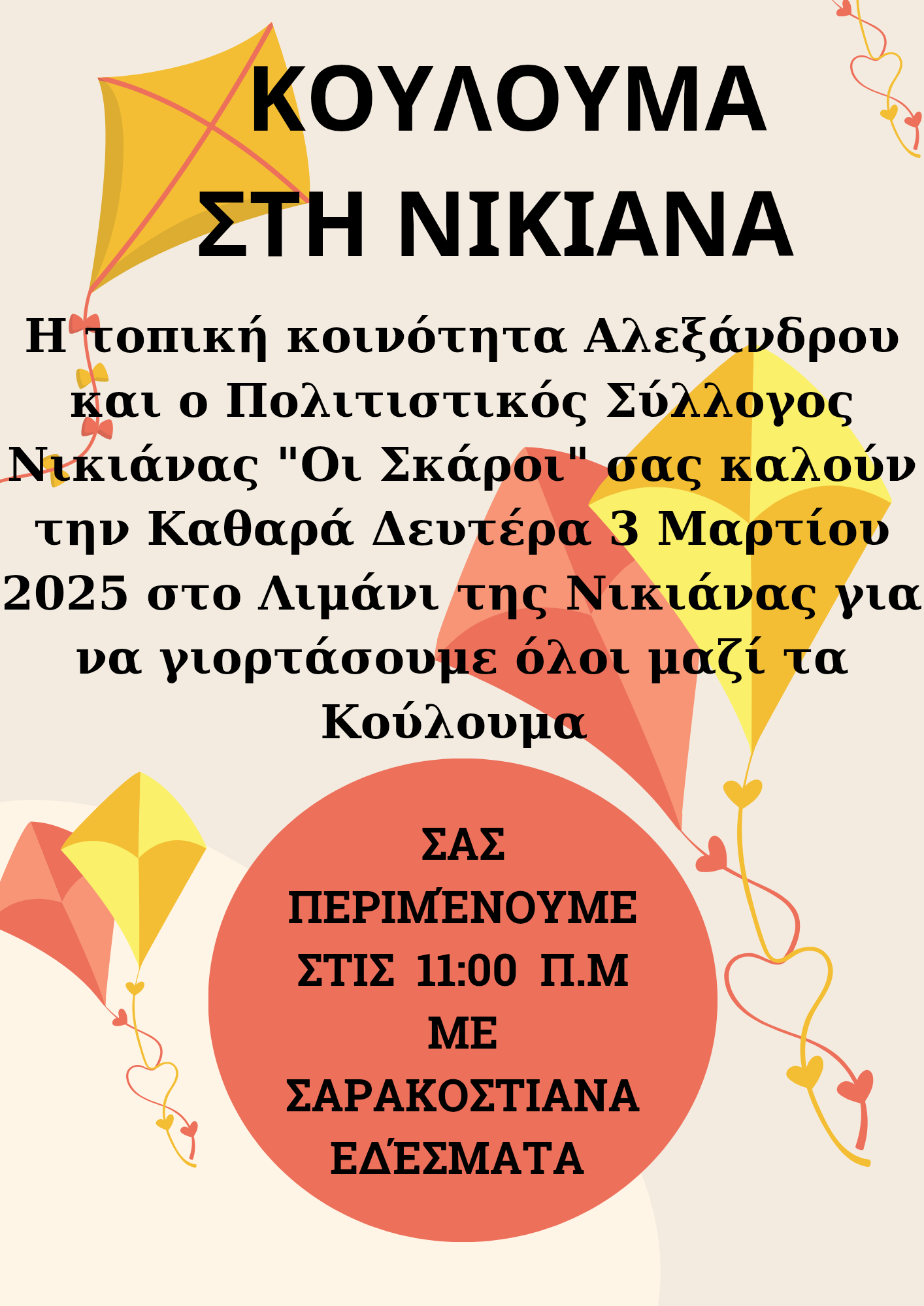 Η Τοπική Κοινότητα Αλεξάνδρου και ο Πολιτιστικός Σύλλογος Νικιάνας «οι Σκάροι» καλούν την Καθαρά Δευτέρα 3 Μαρτίου 2025, στις 11.00 το πρωί, στο Λιμάνι της Νικιάνας, στον εορτασμό των Κούλουμων.