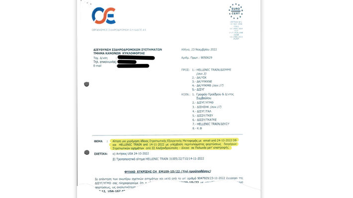 Τα έγγραφα που έχει στη διάθεσή του ο «Ριζοσπάστης» προέρχονται από την ηλεκτρονική αλληλογραφία μεταξύ του Τμήματος Εμπορευματικών Μεταφορών της «Hellenic Train» και του Τμήματος Κανόνων Κυκλοφορίας της Διεύθυνσης Σιδηροδρομικών Συστημάτων του ΟΣΕ.