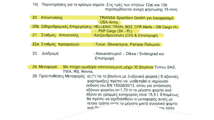 Πρόκειται για δεκάδες άδειες μεταφοράς στρατιωτικού υλικού με «πλήρη αμαξοστοιχία, αποτελούμενη μέχρι 30 βαγόνια». Τις μεταφορές αυτές πραγματοποίησε η «Hellenic Train» σε συνεργασία με άλλες σιδηροδρομικές εταιρείες του εξωτερικού για λογαριασμό του αμερικανικού στρατού.