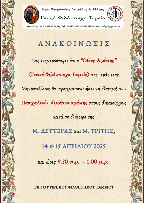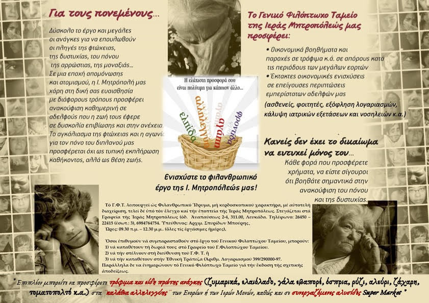 Επειδή δεν είναι δυνατόν να γνωρίζουμε όλους εκείνους που υποφέρουν, παρακαλούμε όλους σας να ενημερώνετε άμεσα το Φιλόπτωχο Ταμείο της ενορίας σας ή κατευθείαν το Γενικό Φιλόπτωχο Ταμείο, με σκοπό να συνδράμουμε όλοι μαζί εγκαίρως, όσο μπορούμε περισσότερο στους αναξιοπαθούντες αυτούς αδελφούς μας, στηριζόμενοι στα φιλάνθρωπα συναισθήματα όλων, διασφαλίζοντας παράλληλα ένα αξιοπρεπές επίπεδο ζωής για τους πάσχοντες συνανθρώπους μας.
