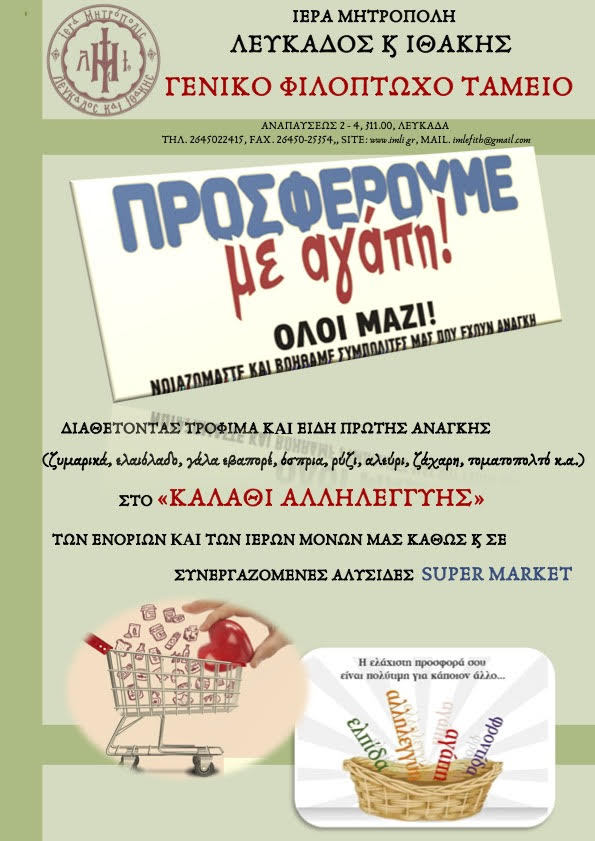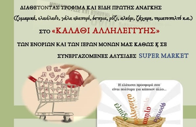 Ο καθένας από εσάς που θα προσέρχεται στον Ιερό Ναό ή την Ιερά Μονή, αν φυσικά επιθυμεί και διευκολύνεται, ας αφήνει ένα τρόφιμο (ζυμαρικά, ελαιόλαδο, γάλα εβαπορέ, όσπρια, ρύζι, αλεύρι, ζάχαρη, τοματοπολτό κ.α.) ή άλλο είδος στο «ΚΑΛΑΘΙ ΑΛΛΗΛΕΓΓΥΗΣ». Έτσι όλοι μαζί θα σηκώσουμε το βάρος των δυσκολεμένων οικογενειών της Μητροπολιτικής μας Περιφέρειας οι οποίες ανέρχονται περίπου στις 500 συνολικώς.
