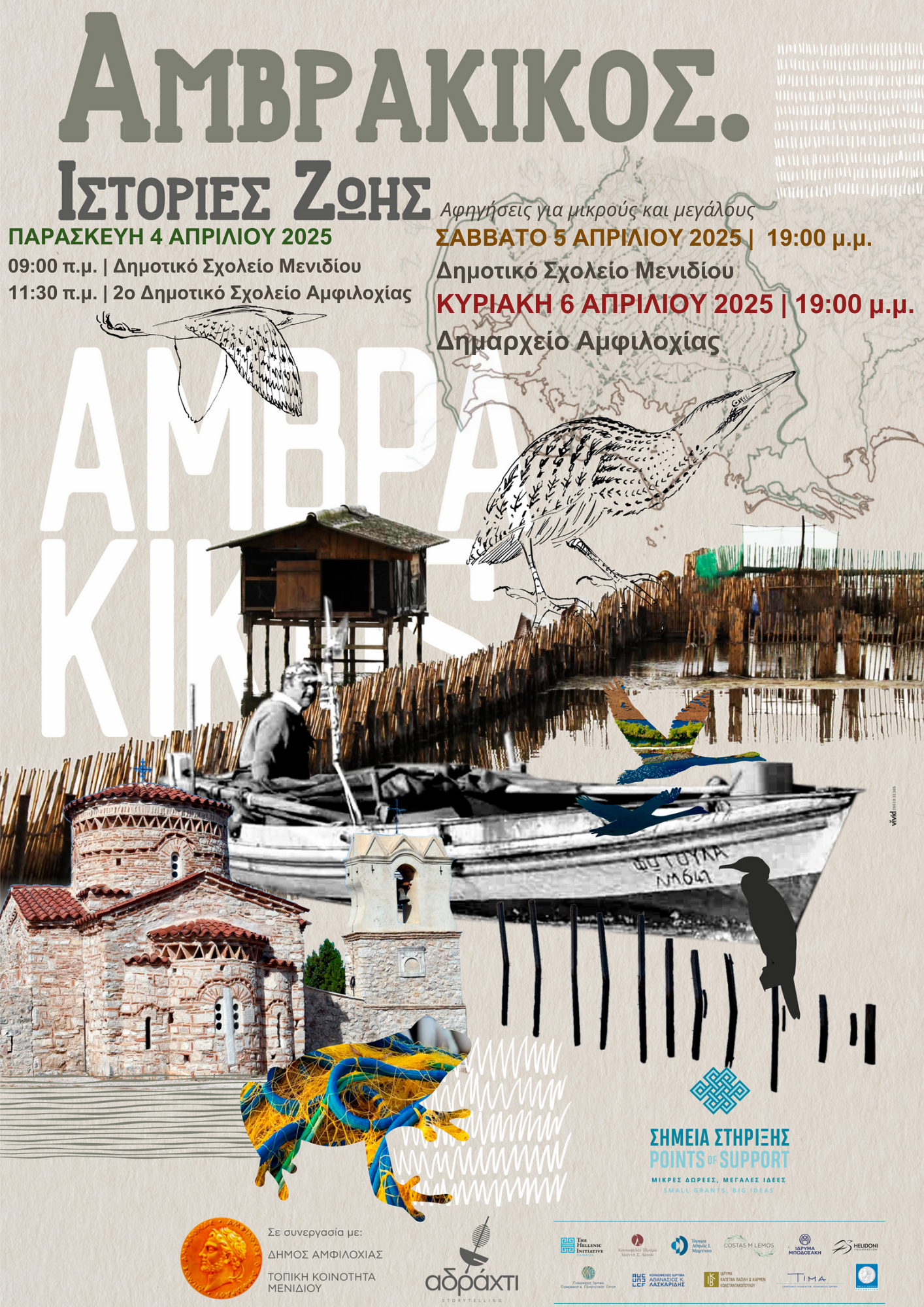Ο Δήμος Αμφιλοχίας σε συνεργασία με το Αδράχτι (Αστική Μη Κερδοσκοπική Εταιρεία), διοργανώνει την Παρασκευή 4 Απριλίου 2025 και το Σάββατο και Κυριακή 5 και 6 Απριλίου 2025, δράσεις ευαισθητοποίησης με τίτλο «Αμβρακικός. Ιστορίες ζωής» για μαθητές και ενήλικες για τη σημασία της προστασίας του μοναδικού οικοσυστήματος του Αμβρακικού Κόλπου.