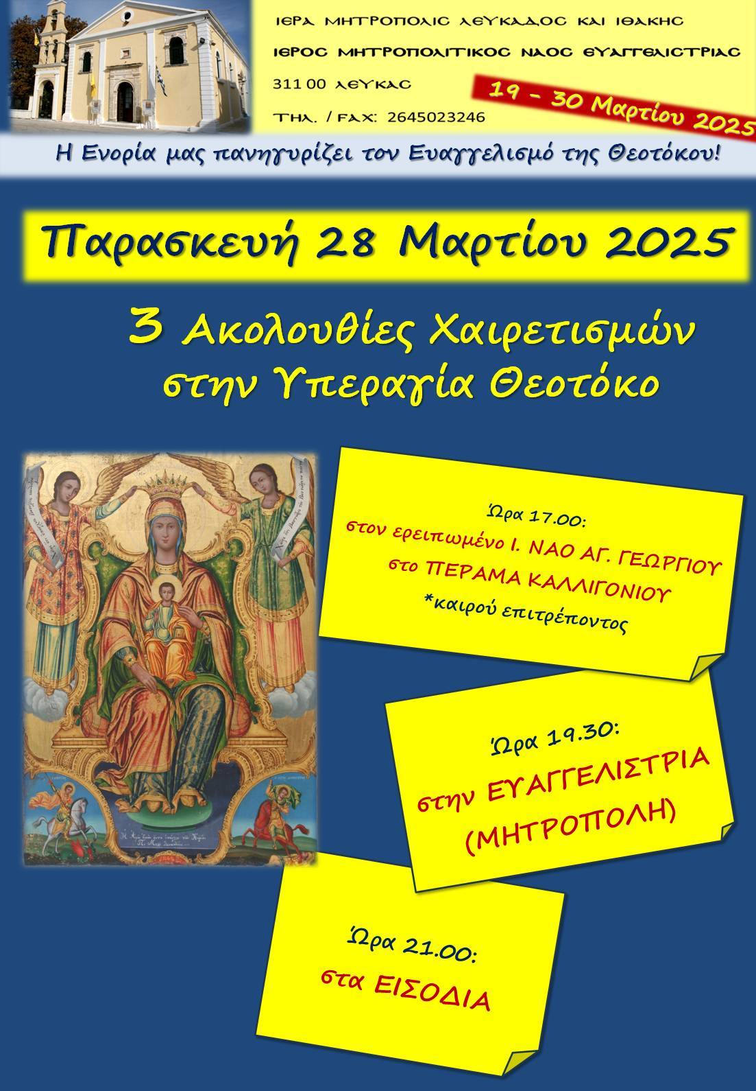 Το αυριανό –Παρασκευή Μαρτίου 2025– πρόγραμμα της ενορίας Ευαγγελιστρίας Λευκάδας με τρεις ακολουθίες Χαιρετισμών στην Υπεραγία Θεοτόκο.