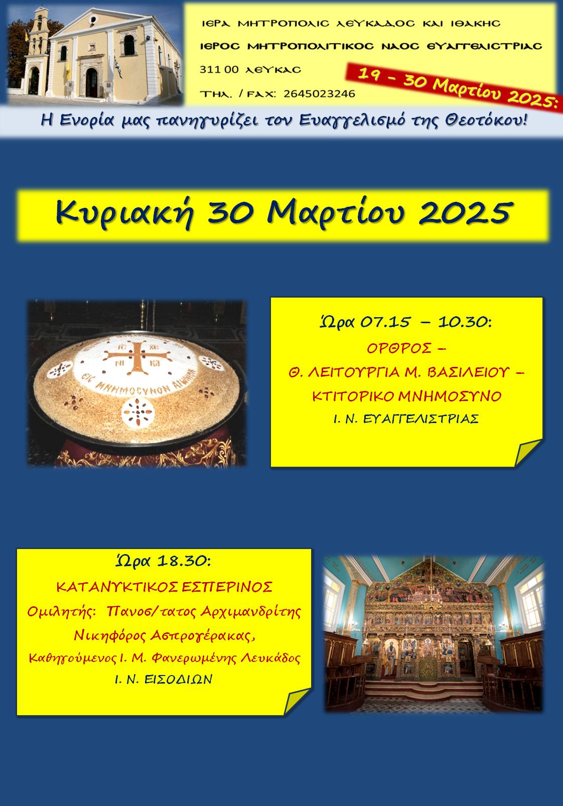 Το πρόγραμμα της Κυριακής 30 Μαρτίου στην ενορία Ευαγγελιστρίας Λευκάδας