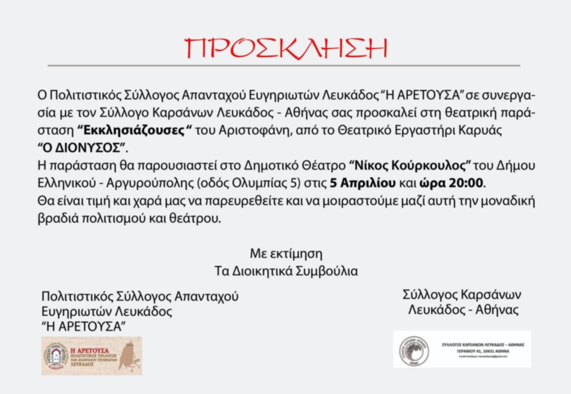 Ο Πολιτιστικός Σύλλογος Απανταχού Ευγηριωτών Λευκάδος «Η Αρετούσα» σε συνεργασία με τον Σύλλογο Καρσάνων Λευκάδος – Αθήνας σας προσκαλεί στη θεατρική παράσταση «Εκκλησιάζουσες» του Αριστοφάνη από το θεατρικό Εργαστήρι Καρυάς «Ο Διόνυσος».