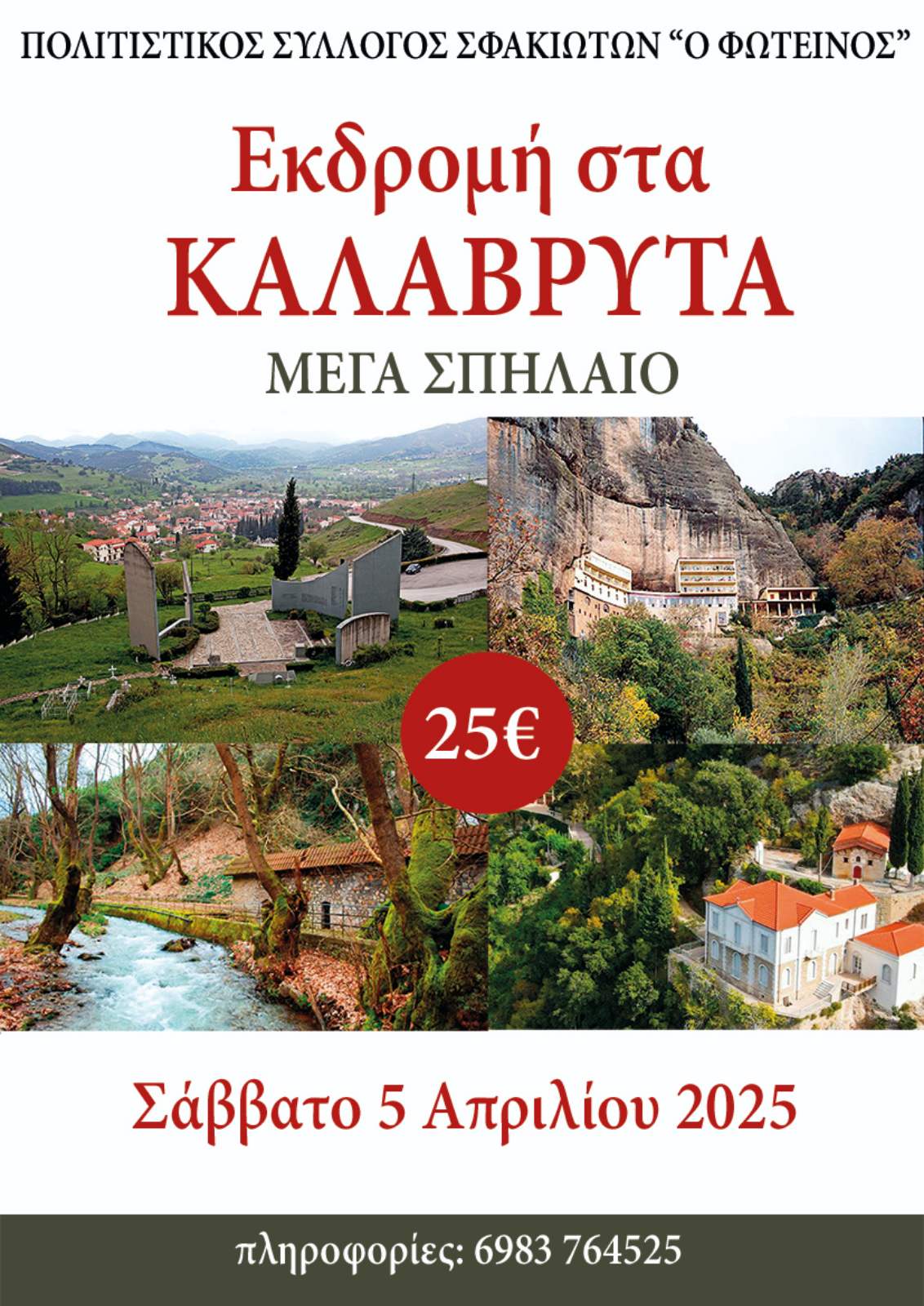 Εκδρομή στα Καλάβρυτα – Μέγα Σπήλαιο διοργανώνει το Σάββατο 5 Απριλίου ο Πολιτιστικός Σύλλογος Σφακιωτών «Ο Φωτεινός».