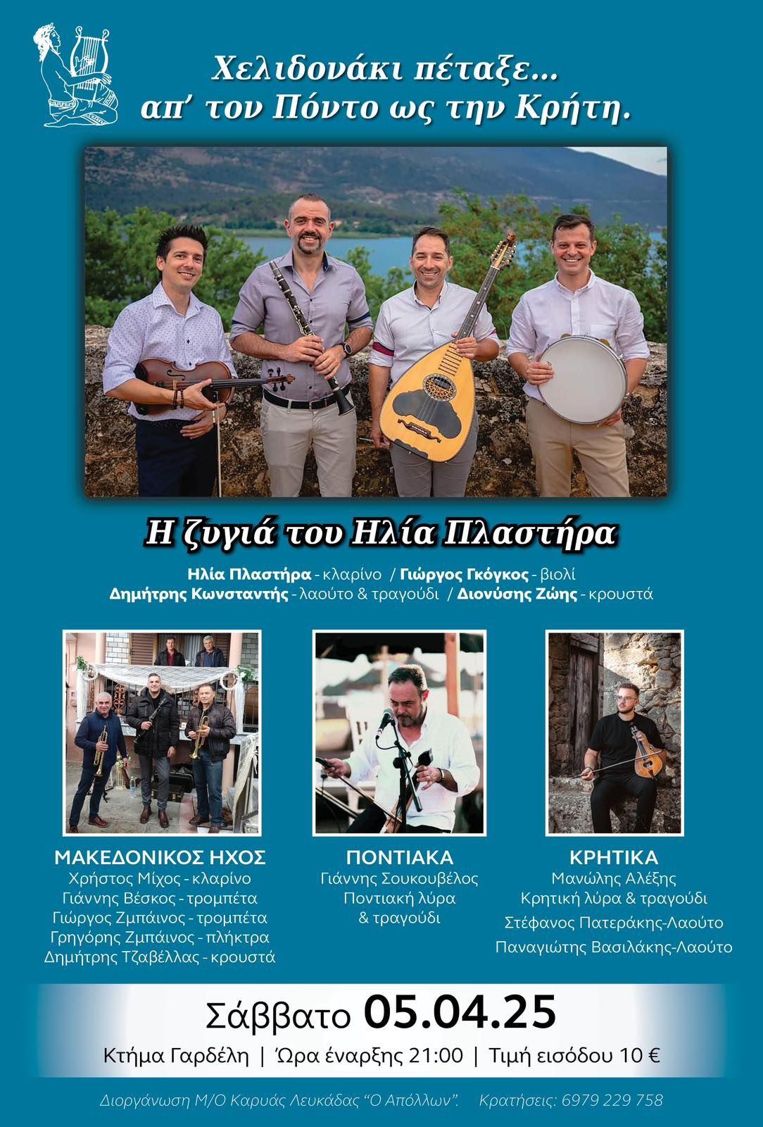 Το Διοικητικό συμβούλιο του Μουσικοφιλολογικού Ομίλου Καρυάς Λευκάδας «Ο ΑΠΟΛΛΩΝ» σας προσκαλεί στην εκδήλωση που διοργανώνει το Σάββατο 5 Απριλίου 2025 και ώρα 21:00 στο κτήμα Γαρδέλη στο Νυδρί, με τίτλο «Χελιδονάκι πέταξε… από τον Πόντο ως την Κρήτη».