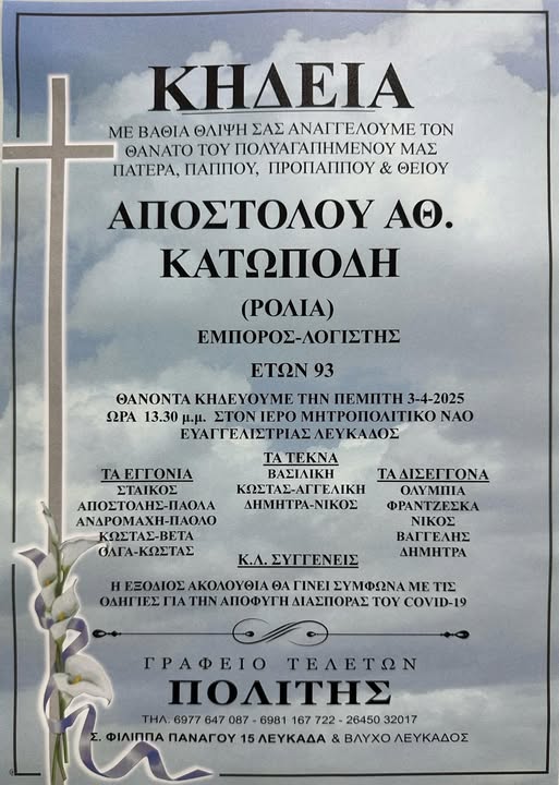 Πέθανε ο Απόστολος Αθ. Κατωπόδης (Ρόλιας) – Την Πέμπτη στις 13:30 στο Μητροπολιτικό Ναό Ευαγγελιστρίας η κηδεία | Λευκαδίτικα Νέα - Lefkada News
