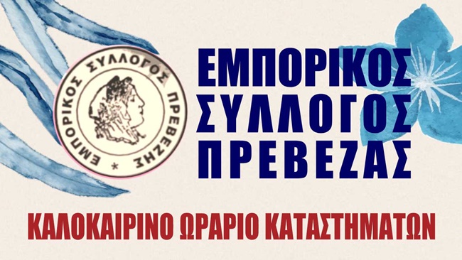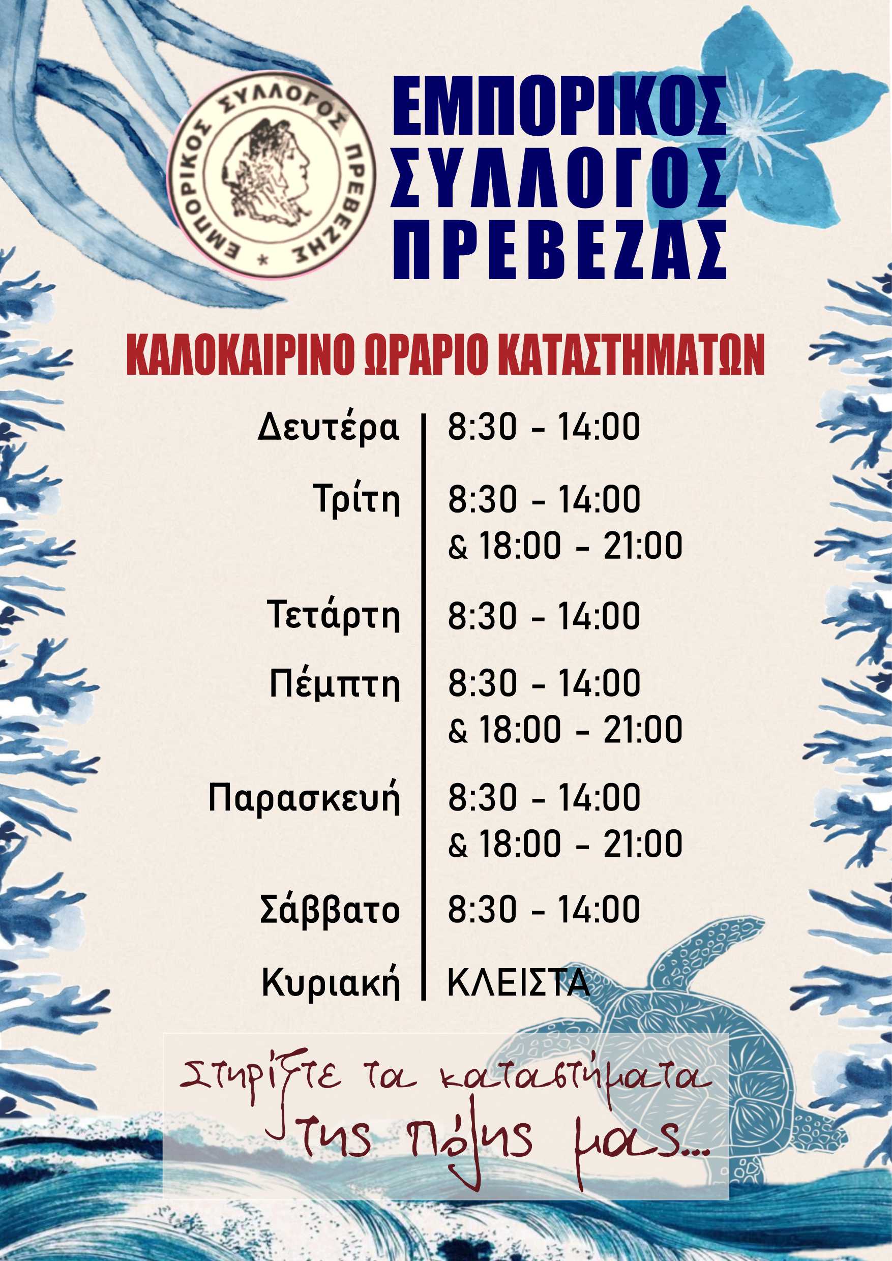 Το καλοκαιρινό ωράριο καταστημάτων όπως ανακοινώθηκε από τον Εμπορικό Σύλλογο Πρέβεζας:
