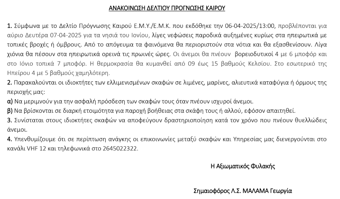 Ανακοίνωση δελτίου πρόγνωσης του καιρού για αύριο Δευτέρα 7 Απρίλη.