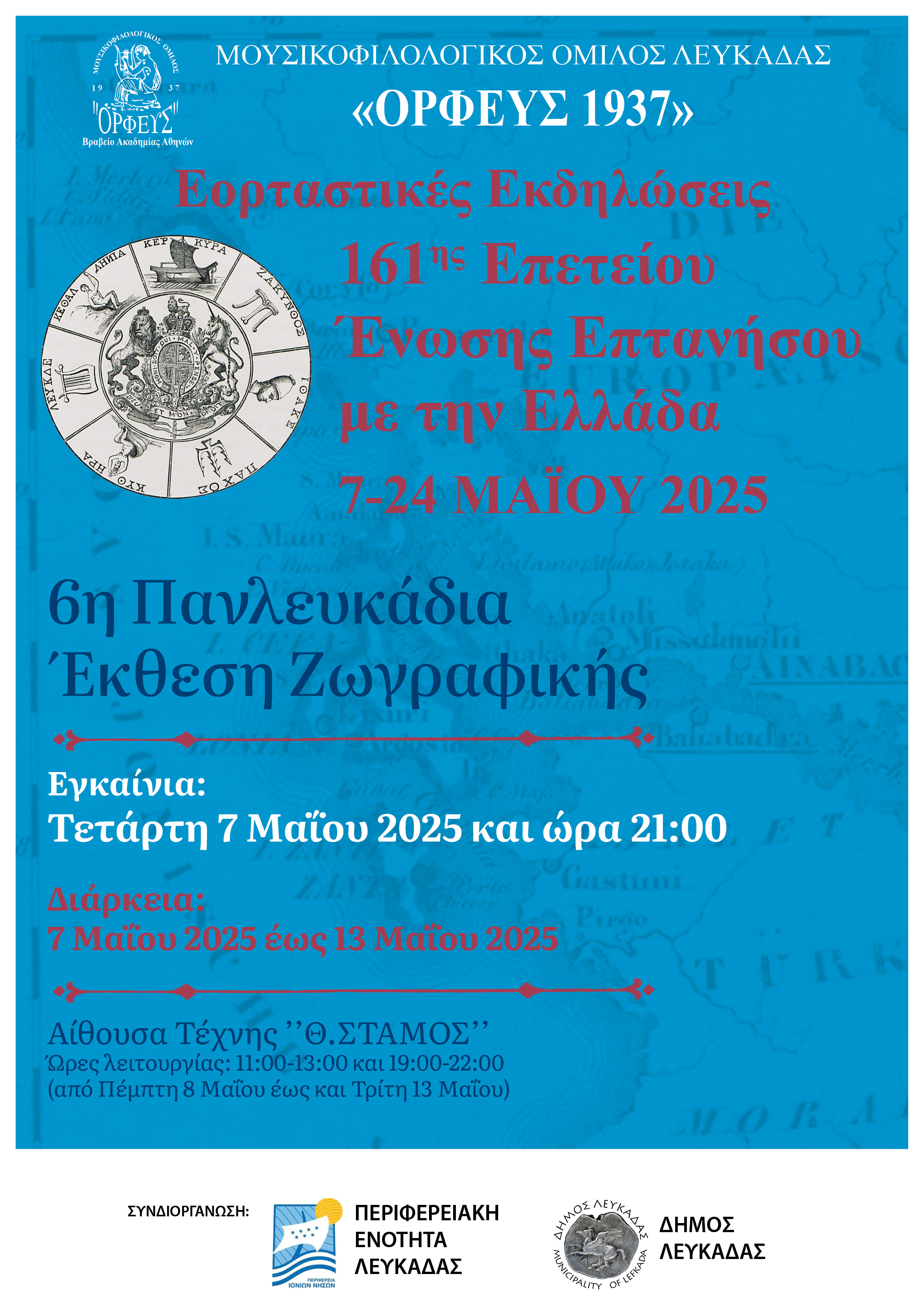 Το ΔΣ του «Ορφέα» Λευκάδας σας προσκαλεί στα εγκαίνια της 6ης Πανλευκάδιας έκθεσης ζωγραφικής που θα πραγματοποιηθούν την Τετάρτη 7 Μαΐου 2025 και ώρα 21:00 στην αίθουσα τέχνης «Θ. Στάμος».