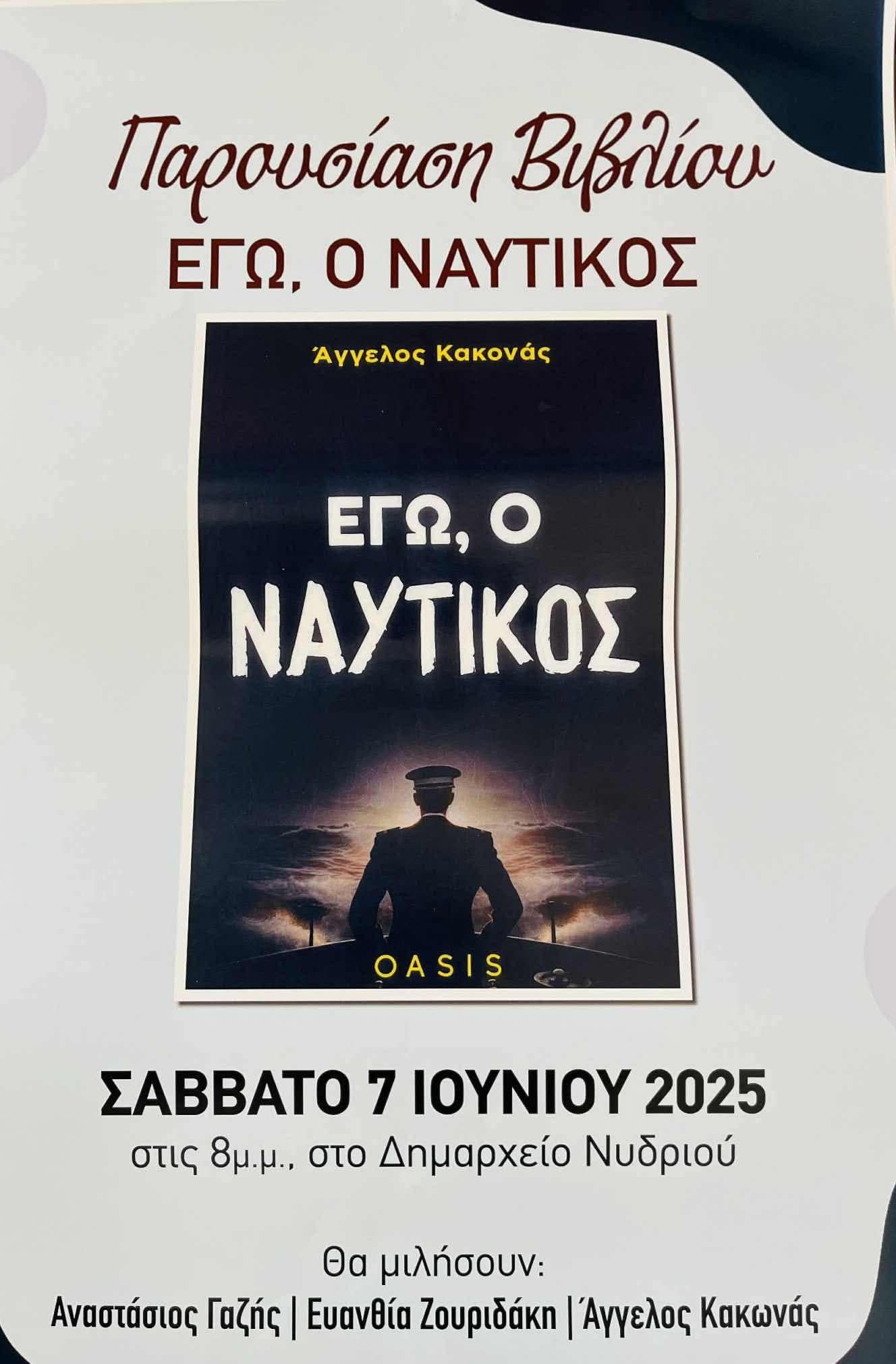 Το βιβλίο «Εγώ ο ναυτικός» του Άγγελου Κακονά* θα παρουσιαστεί το Σάββατο 7 Ιουνίου 2025, στις 8:00 μ.μ., στο πρώην Δημαρχείο Νυδριού.