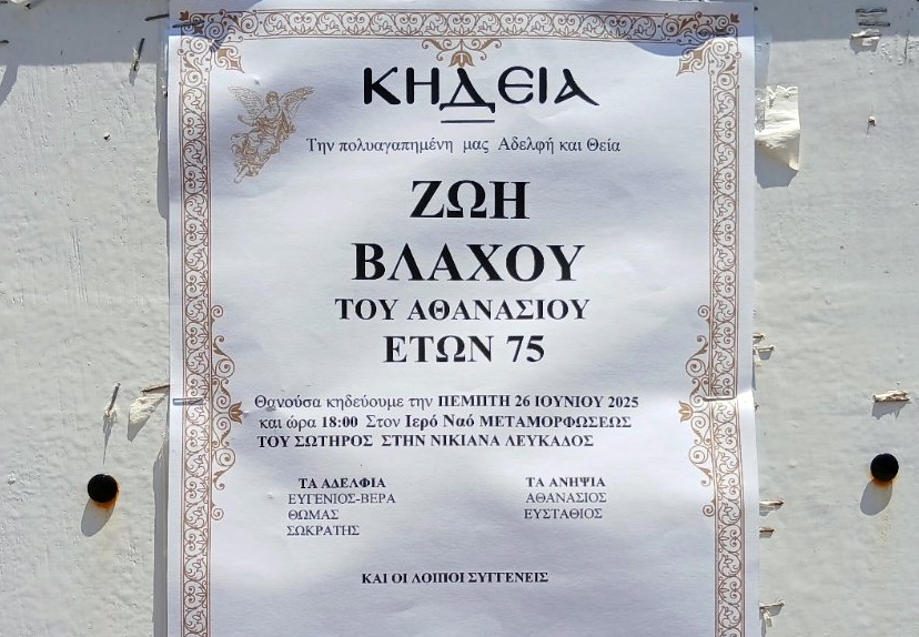 Η κηδεία της θα γίνει σήμερα Πέμπτη 26 Ιουνίου 2025, στις 6:00 μ.μ., στον Ιερό Ναό Μεταμορφώσεως Σωτήρος στη Νικιάνα Λευκάδας.