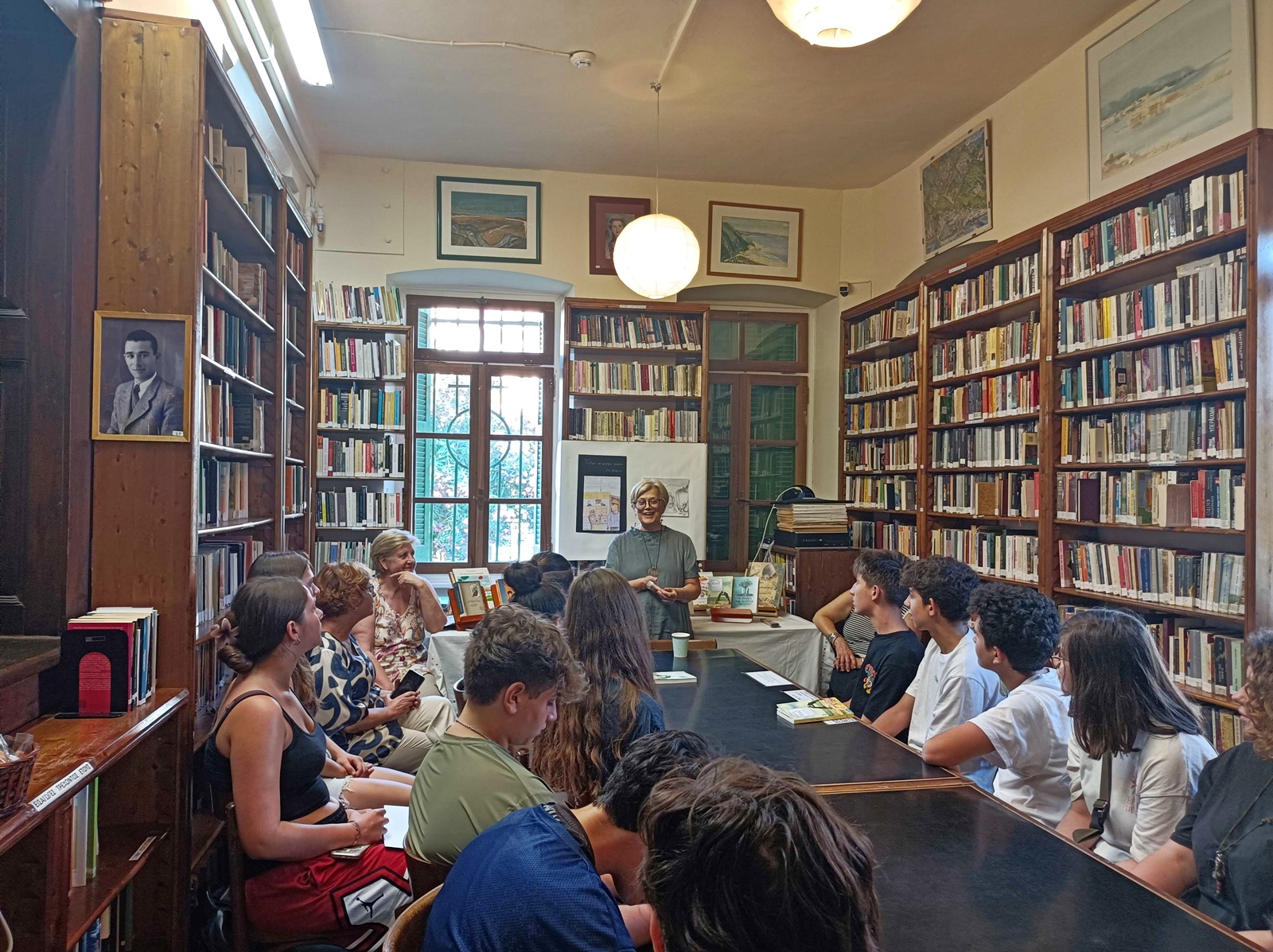 Ανάμεσα σε βιβλία και έργα τέχνης στο αναγνωστήριο της Βιβλιοθήκης, οι μαθητές του 2ου Γυμνασίου, που είχαν διαβάσει βιβλία της, με την καθοδήγηση των καθηγητών τους, συζήτησαν με τη συγγραφέα για τη ζωή και το έργο της, τους χαρακτήρες των βιβλίων και τη δύναμη της λογοτεχνίας και της τέχνης.