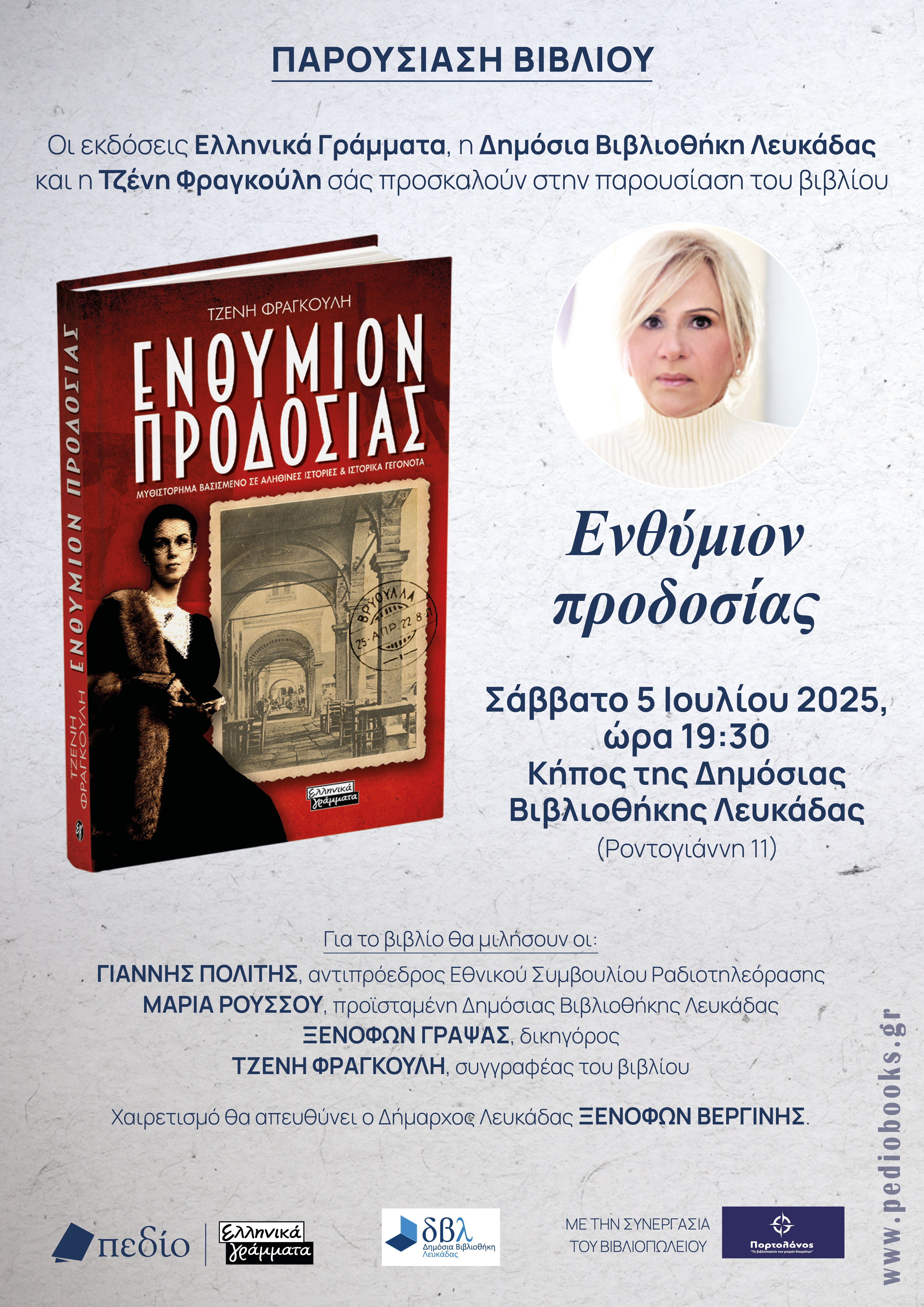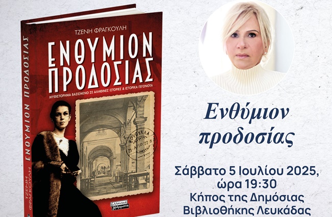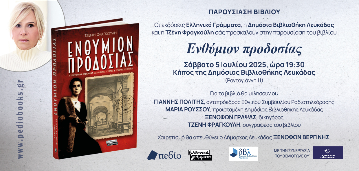 Οι εκδόσεις «Ελληνικά Γράμματα», η Δημόσια Βιβλιοθήκη Λευκάδας και η Τζένη Φραγκούλη σας προσκαλούν στην παρουσίαση του βιβλίου «Ενθύμιον προδοσίας» το Σάββατο 5 Ιουλίου 2025, ώρα 19:30, στον κήπο της Βιβλιοθήκης.