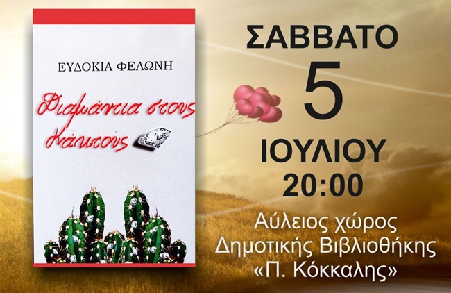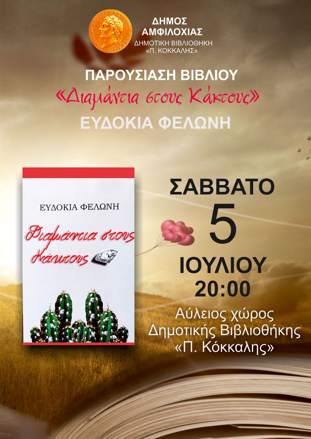 Παρουσίαση του βιβλίου της συγγραφέως Ευδοκίας Φελώνη «Διαμάντια στους κάκτους» διοργανώνει το Σάββατο 5 Ιουλίου στις 20:00 μ.μ. ο Δήμος Αμφιλοχίας και η Δημοτική Βιβλιοθήκη “Π. Κόκκαλης” στον αύλειο χώρο της βιβλιοθήκης.