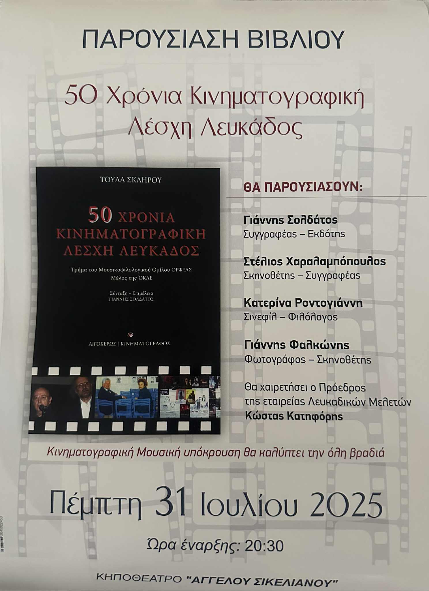 Την Πέμπτη 31 Ιουλίου, στις 20:30, στο Κηποθέατρο «Άγγελος Σικελιανός», θα παρουσιαστεί το βιβλίο «50 χρόνια Κινηματογραφική Λέσχη Λευκάδας» της Τούλας Σκληρού.