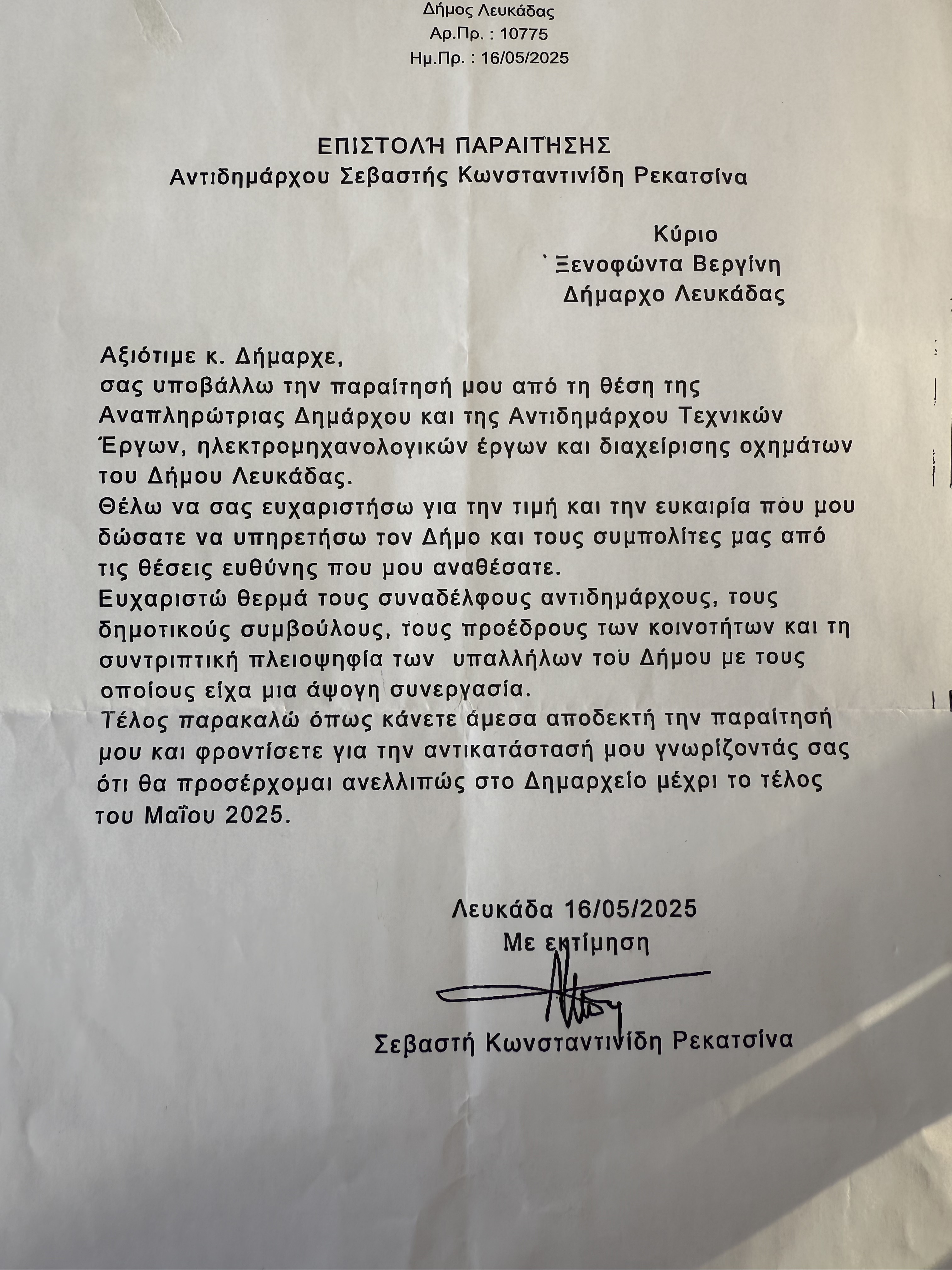 Τέλος παρακαλώ όπως κάνετε άμεσα αποδεκτή την παραίτησή μου και φροντίσετε για την αντικατάστασή μου γνωρίζοντάς σας ότι θα προσέρχομαι ανελλιπώς στο Δημαρχείο μέχρι το τέλος του Μαΐου 2025.