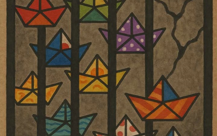 Και τότε, ο Αμίρ άρχισε μα φτιάχνει χάρτινα καραβάκια, πολλά καραβάκια και να μαθαίνει και στα άλλα παιδιά πώς να φτιάχνουν…. Να τα γεμίζουν με λέξεις, ζωγραφιές, ερωτήσεις και να τα βγάζουν το βράδυ στο δρόμο. Ώσπου μια μέρα, η Ζώνη — εκείνη που στένευε κάθε μέρα — γέμισε με χιλιάδες μικρά, χάρτινα καραβάκια. Όλα ταξίδευαν, όχι σε νερό, αλλά πάνω στο χώμα.