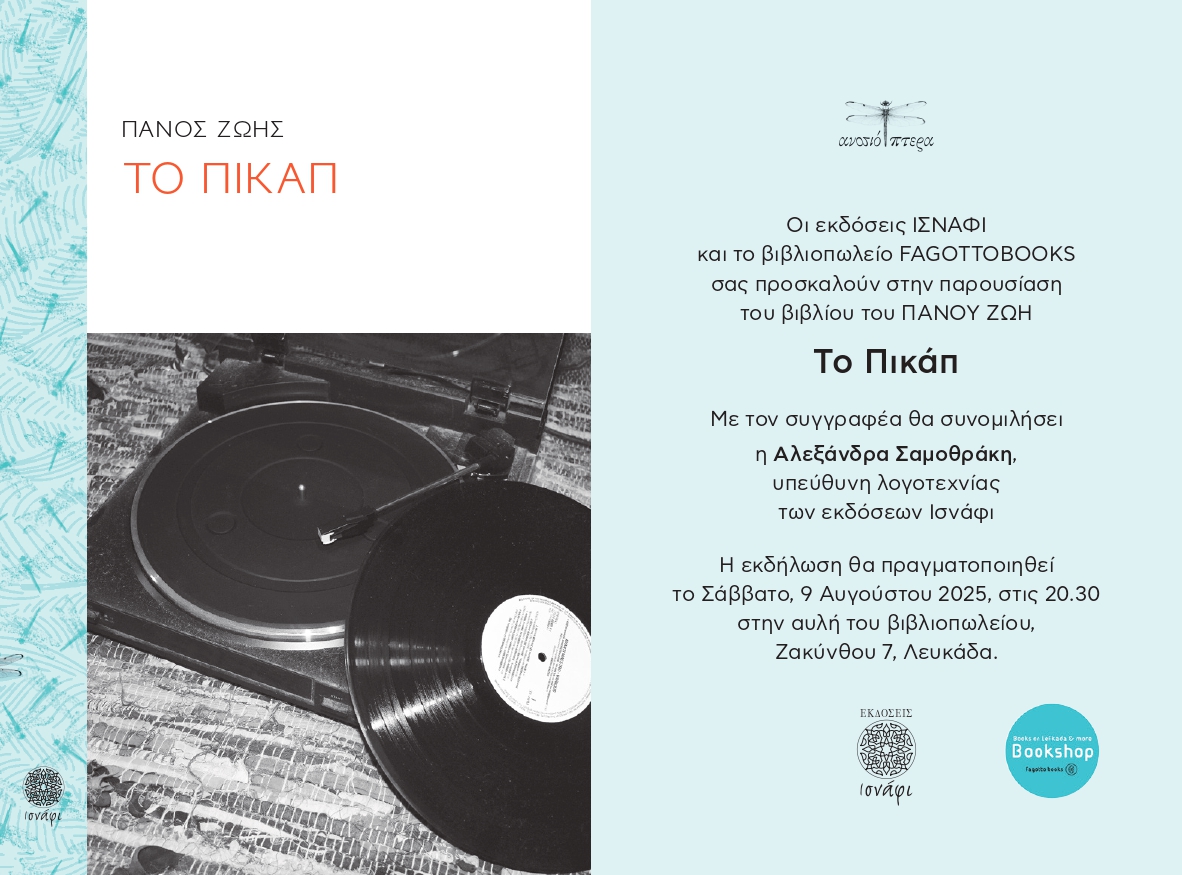 Οι Εκδόσεις ΙΣΝΑΦΙ και το βιβλιοπωλείο Fagottobooks σας προσκαλούν στην παρουσίαση του νέου βιβλίου του Πάνου Ζώη, «Το Πικάπ» το Σάββατο 9 Αυγούστου στην αυλή του βιβλιοπωλείου στις 20:30.