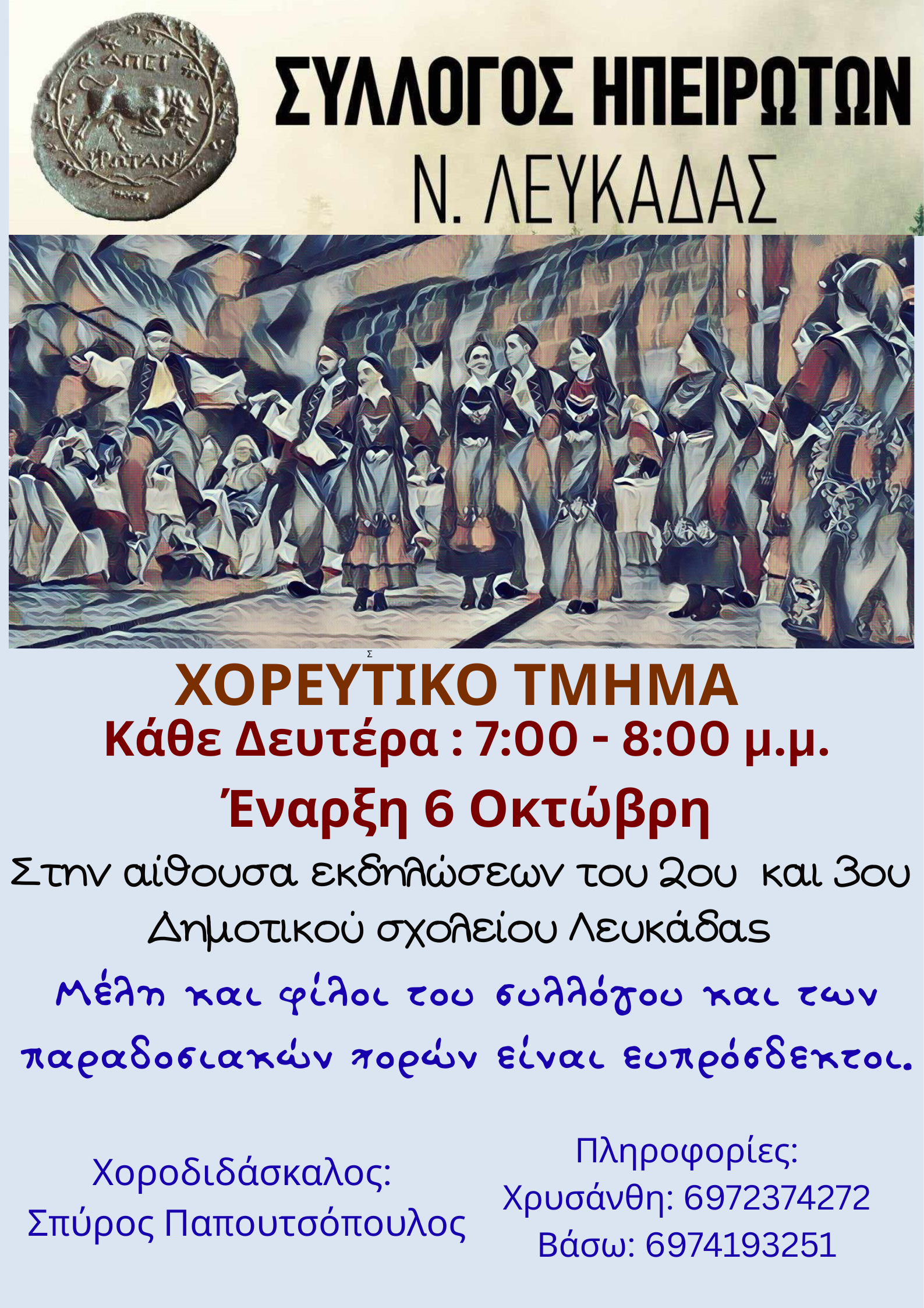 Χοροδιδάσκαλος: Σπύρος Παπουτσόπουλος. Πληροφορίες: Χρυσάνθη (6972374272) – Βάσω (6974193251)