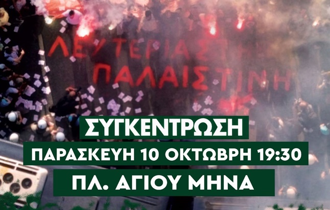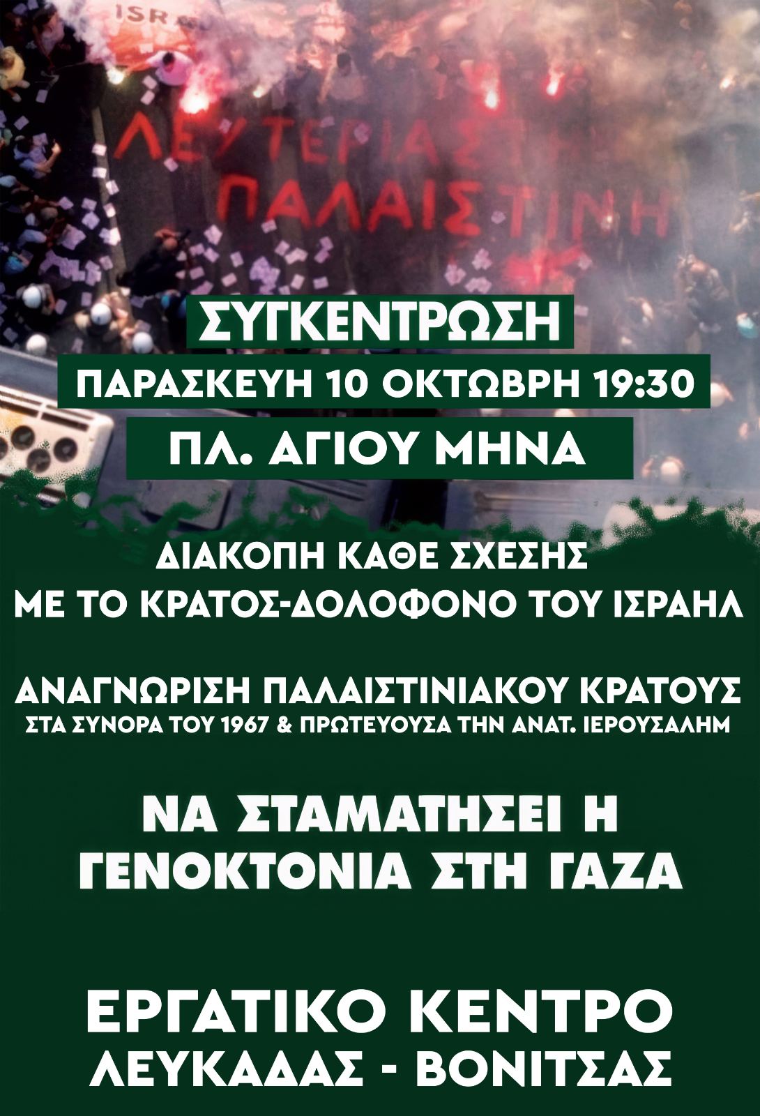 Σε συγκέντρωση αλληλεγγύης στον Παλαιστινιακό λαό καλεί την Παρασκευή 10 Οκτώβρη 2025, στις 19:30, στην πλατεία του Αγίου Μηνά, το Εργατικό Κέντρο Λευκάδας-Βόνιτσας.