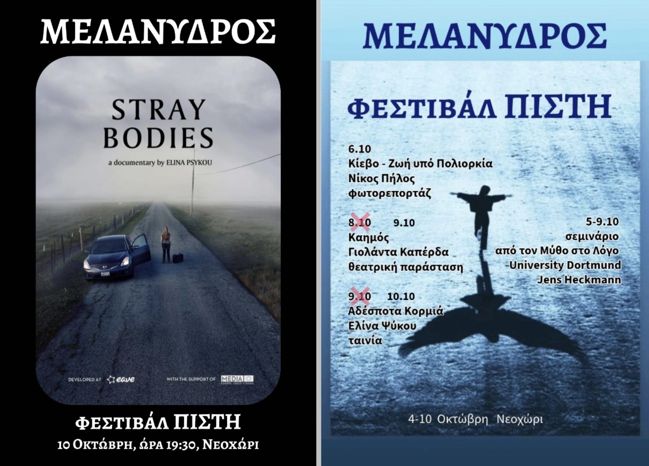 Ο ΜΕΛΑΝΥΔΡΟΣ σας προσκαλεί την Παρασκευή 10 Οκτωβρίου και ώρα 19:30 στο Νεοχώρι στην προβολή της ταινίας – ντοκιμαντέρ «Stray Bodies» («Αδέσποτα κορμιά») της Ελίνας Ψύκου.