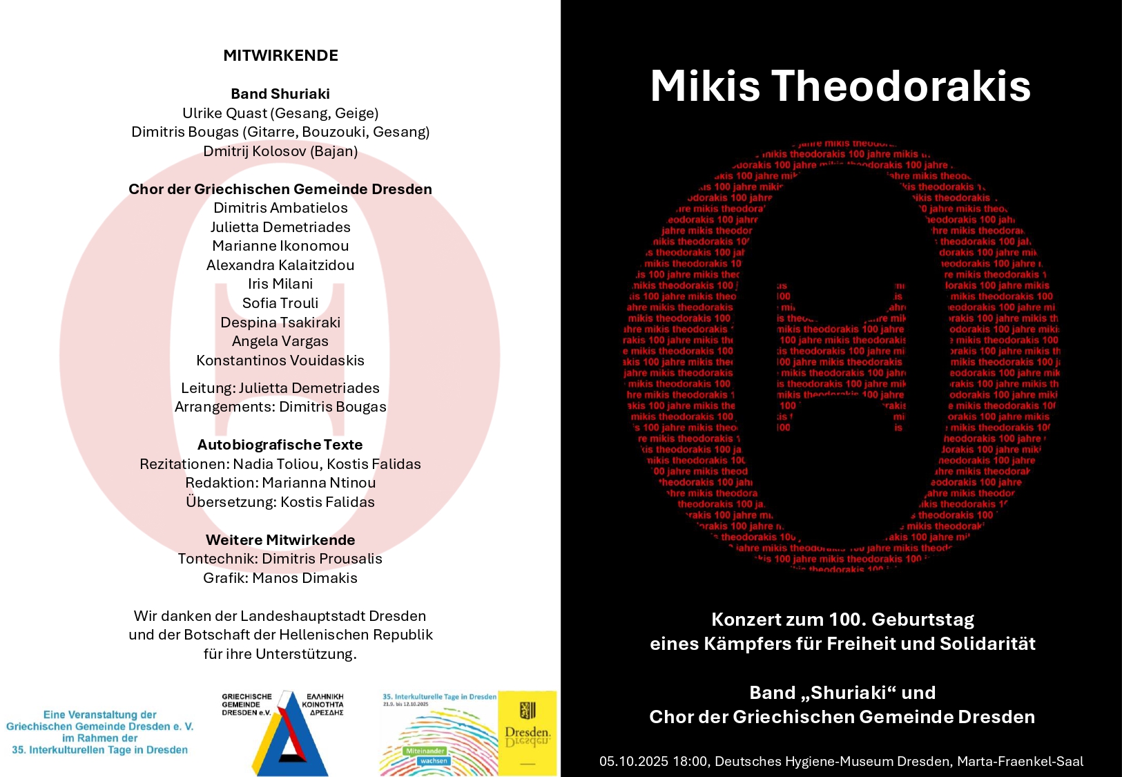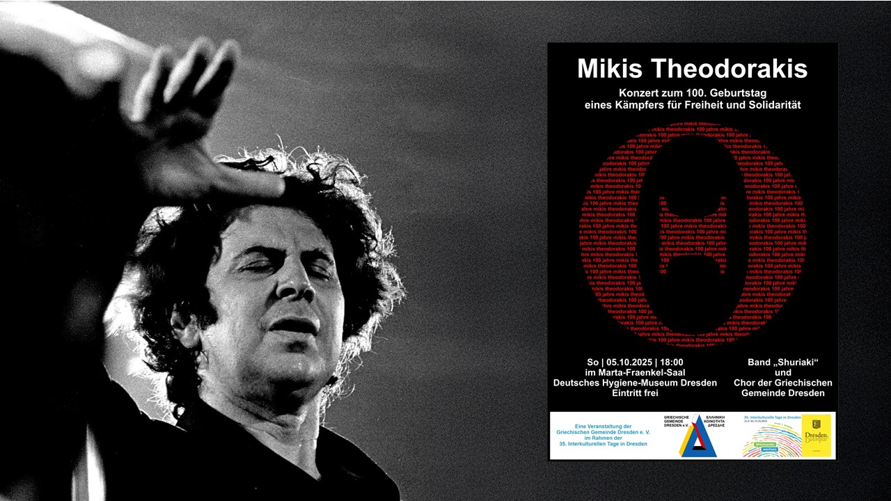 Με μεγάλη επιτυχία πραγματοποιήθηκε στις 5 Οκτωβρίου συναυλία της Ελληνικής Κοινότητας Δρέσδης, αφιερωμένη στα 100 χρόνια από τη γέννηση του Μίκη Θεοδωράκη, σε αίθουσα κεντρικού μουσείου της πόλης, με το κοινό να ανταποκρίνεται με επανειλημμένο και παρατεταμένο θερμό χειροκρότημα σε κάθε στιγμή της βραδιάς. Είναι χαρακτηριστικό ότι πρόκειται για τη μαζικότερη εκδήλωση της Κοινότητας τα τελευταία 35 χρόνια, σε μια πόλη που οι κάτοικοι ελληνικής καταγωγής δεν ξεπερνούν τους 700.