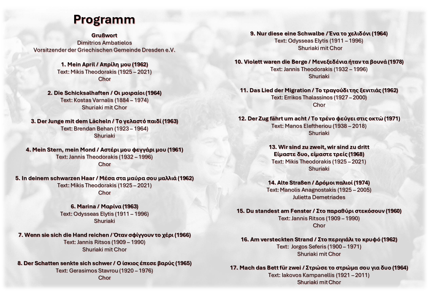 Το κοινό, Έλληνες και κυρίως Γερμανοί, παρακολούθησε με βαθιά συγκίνηση το αφιέρωμα, το οποίο ξεδίπλωσε τη ζωή και το έργο του Μίκη Θεοδωράκη. Μέσα από αυτοβιογραφικές αφηγήσεις, φωτίστηκε η πολύπλευρη προσωπικότητα του δημιουργού, η πορεία του μέσα από τους αγώνες του ελληνικού λαού και η αδιάρρηκτη, ζωντανή σχέση του με αυτούς. Ιδιαίτερη έμφαση δόθηκε στη σχέση του συνθέτη με τη Δρέσδη, τόσο κατά την περίοδο της χούντας, όταν χιλιάδες εργαζόμενοι και παιδιά εξέφρασαν την αλληλεγγύη τους στον ίδιο προσωπικά, αλλά και στον ελληνικό λαό γενικότερα, όσο και αργότερα, μέσα από τις συνεργασίες του με κορυφαία μουσικά σύνολα της πόλης — όπως τη Φιλαρμονική Δρέσδης, τη Χορωδία Μπετόβεν και τη διάσημη παιδική χορωδία Kreuzchor.