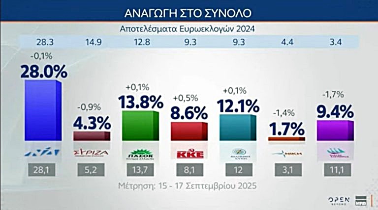 Προβάδισμα της Νέας Δημοκρατίας καταγράφει η νέα δημοσκόπηση της MRB για λογαριασμό του OPEN. Στην αναγωγή επί του συνόλου, η Νέα Δημοκρατία συγκεντρώνει 28%, ποσοστό που κινείται στα επίπεδα των ευρωεκλογών.