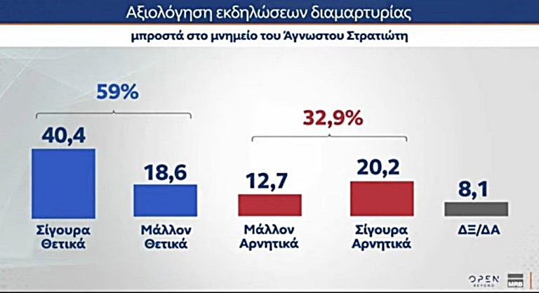Στο ερώτημα αν πρέπει να πραγματοποιούνται εκδηλώσεις διαμαρτυρίας μπροστά στο Μνημείο του Άγνωστου Στρατιώτη, το 59% απαντά σίγουρα ή μάλλον θετικά, ενώ το 32,9% σίγουρα ή μάλλον αρνητικά. Δηλαδή, έξι στους δέκα πολίτες τάσσονται υπέρ του δικαιώματος διαμαρτυρίας στο συγκεκριμένο σημείο.