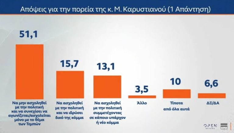 Η Μαρία Καρυστιανού απολαμβάνει θετικής γνώμης από το 50% των πολιτών, ενώ το 24,9% δηλώνουν ότι έχουν όχι ευνοϊκή άποψη.