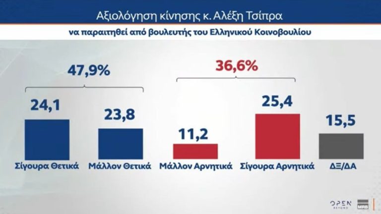 Όσον αφορά την παραίτηση Τσίπρα, το 47,9% των ερωτηθέντων την αξιολογεί θετικά, ενώ το 36,6% αρνητικά.