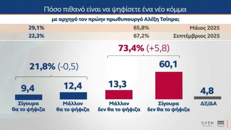 Μάλιστα, 21,8% δηλώνουν ότι θα ψήφιζαν ένα νέο κόμμα με αρχηγό τον πρώην πρωθυπουργό, ενώ το 73,4% το απορρίπτουν. Σε σχέση με προηγούμενες μετρήσεις, παρατηρείται πτώση στην πρόθεση στήριξης ενός τέτοιου εγχειρήματος.