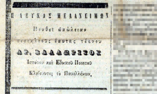 «Η Λευκάς μελανείμων πενθεί απώλειαν περικλεούς αυτής τέκνου ΑΡ. ΒΑΛΑΩΡΙΤΗ Ιππότου και Εθνικού Ποιητού Κλείσαντος το Πανελλήνιον»
