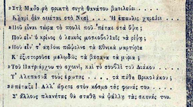 Μόλις κατά την 21 φθίνοντος περί ώραν 6 π.μ., ηκούσθη ο χωρισμός της ύλης εκ της ψυχής του αοιδίμου εθνικού ποιητού, πάσχοντος προ πρότινος εκ καρδιακού νοσήματος, μεταβάσης εν τω αΰλω κόσμω, κατά τον προορισμόν του Πλάστου, πάραυτα αστραπηδόν ενέπεσε πάσι τοις ημετέροις συμπολίταις αθυμία μεγίστη· παντού ηκούοντο θρήνοι, οδυρμοί, και στόνοι γοεροί και οιμωγαί επί τη υστερήσει τοιούτου γενικού πατρός· άπαντα τα εμπορικά καταστήματα ησφαλίσθησαν αμέσως, μελανειμονήσαντα ψιθυρισμός ηκούετο παντού εν όλαις ταις τάξεσι της ημετέρας κοινωνίας εν πάση ηλικία και τάξει περί του αώρου θανάτου αυτού.