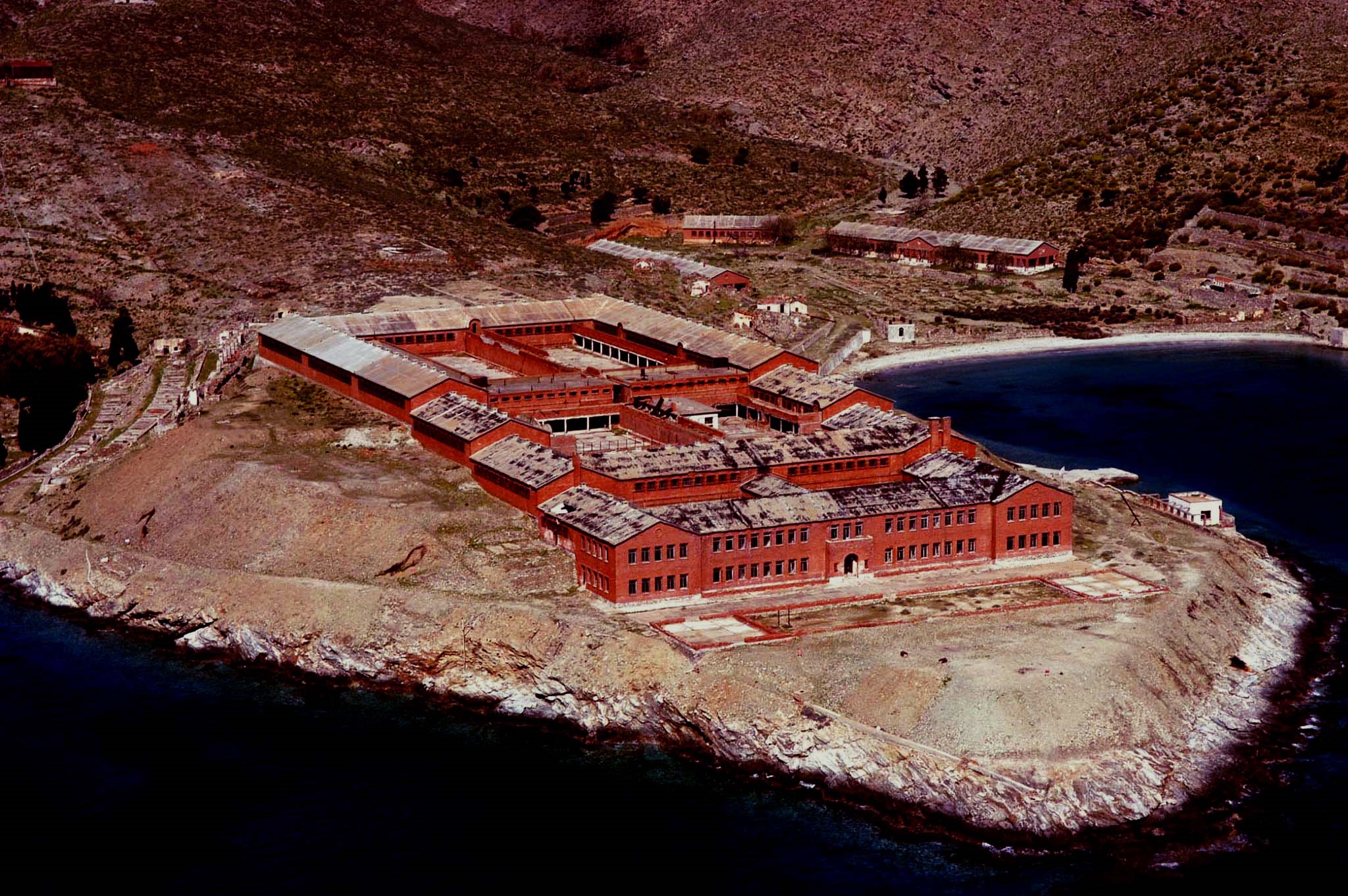Οι εγκαταστάσεις των φυλακών στη Γυάρο, χτισμένες με τον μόχθο των εξόριστων, διακρίνονται στην άνυδρη ανατολική ακτή του νησιού. Η Γυάρος -ή Γιούρα, όπως την αποκαλούσαν πολλοί εξόριστοι- έχει χαραχθεί στην ιστορία ως ένα από τα πλέον μαρτυρικά μέρη του νεότερου ελληνισμού. Δεν είναι τυχαίο ότι την είπαν “θανατονήσι”: από το 1947 έως το 1952, ξανά το 1955-1961 και πάλι στη δικτατορία 1967-1974, το μικρό αυτό ξερονήσι λειτούργησε ως τόπος εξορίας και βασανισμού χιλιάδων ανθρώπων. Περισσότεροι από 18.000 πολιτικοί κρατούμενοι πέρασαν από τη Γυάρο μόνον την πρώτη περίοδο του Εμφυλίου – αριθμός συνταρακτικός. Οι κρατούμενοι πετάχτηκαν στους πέντε άνυδρους όρμους της ανατολικής ακτής, όπου «κάθε όρμος ήταν ένα στρατόπεδο κλεισμένο με συρματοπλέγματα… 2-3 μέτρα από τη θάλασσα». Ζούσαν στριμωγμένοι σε σκηνές, χωρίς νερό, χωρίς σκιά. Και σαν να μην έφταναν οι άθλιες φυσικές συνθήκες, αναγκάζονταν από τους δεσμοφύλακες να σπάσουν πέτρα και να χτίσουν από την αρχή τις εγκαταστάσεις της φυλακής – με ίδια χέρια, με αίμα και πέτρες. Αυτή η καταναγκαστική εργασία για την ανέγερση των ίδιων τους των δεσμών ήταν η κορωνίδα της ψυχολογικής εξόντωσης. Κάθε κτίριο -το κεντρικό οικοδόμημα των φυλακών ανάμεσα στον Δ΄ και Ε΄ όρμο, τα διοικητήρια, ακόμη και οι στέρνες- σχεδιάστηκε ώστε να αποτελεί μέρος του βασανιστηρίου, εκμεταλλευόμενο την αφιλόξενη μορφολογία του τοπίου.