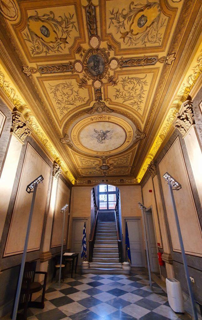 Μπαίνοντας στην είσοδό του «Μεγάλου σπιτιού» εντυπωσιάστηκα με τις οροφογραφίες, τις τοιχογραφίες και τα μωσαϊκά στο δάπεδο! Ανεβαίνοντας τη μαρμάρινη σκάλα φτάσαμε στο δεύτερο όροφο. Στο χώρο του Μάνου Χατζιδάκι. Καθίσαμε σε μια φωτεινή αίθουσα. Τα πατώματα σκούρα, οι τοίχοι φρεσκοβαμμένοι, οι τοιχογραφίες θαυμάσιες … Από τα ανοιχτά παράθυρα έμπαινε φως σε κάθε γωνιά… Ένα άρωμα αρχοντικής ζωής. Στη μέση του δωματίου, κοντά στο παράθυρο, υπήρχε ένα πιάνο. Από τα άλλα παράθυρα αγνάντευα την ομορφιά της Ξάνθης… Της Ξάνθης του Μάνου, όπως την κουβαλούσε πάντα εκείνος…
