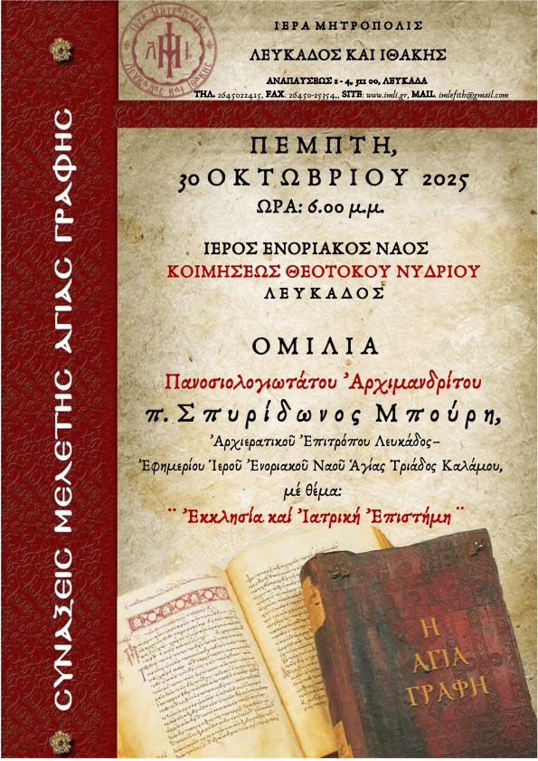 Όπως ενημερώνει η Μητρόπολη Λευκάδας και Ιθάκης, την Πέμπτη 30 Οκτωβρίου 2025, στις 6:00 μ.μ., στον Ιερό Ενοριακό Ναό Κοιμήσεως Θεοτόκου στο Νυδρί, στο πλαίσιο των συνάξεων μελέτης της Αγίας Γραφής, θα μιλήσει ο Πανοσιολογιώτατος ’Αρχιμανδρίτης π. Σ π υ ρ ί δ ω ν Μ π ο ύ ρ η ς, ’Αρχιερατικός ’Επίτροπος Λευκάδος – ’Εφημέριος Ἱεροῦ ’Ενοριακοῦ Ναοῦ Ἁγίας Τριάδος Καλάμου, μέ θέμα: «’Εκκλησία καί ’Ιατρική ’Επιστήμη».