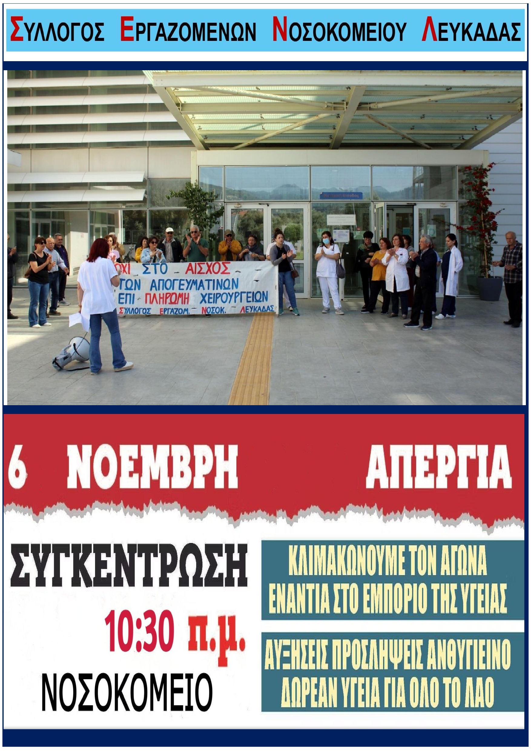 Στην πανελλαδική απεργία των Υγειονομικών την Πέμπτη 6 Νοέμβρη και στη συγκέντρωση στις 10:30 πμ στο νοσοκομείο καλεί ο Σύλλογος Εργαζομένων του Νοσοκομείου Λευκάδας.