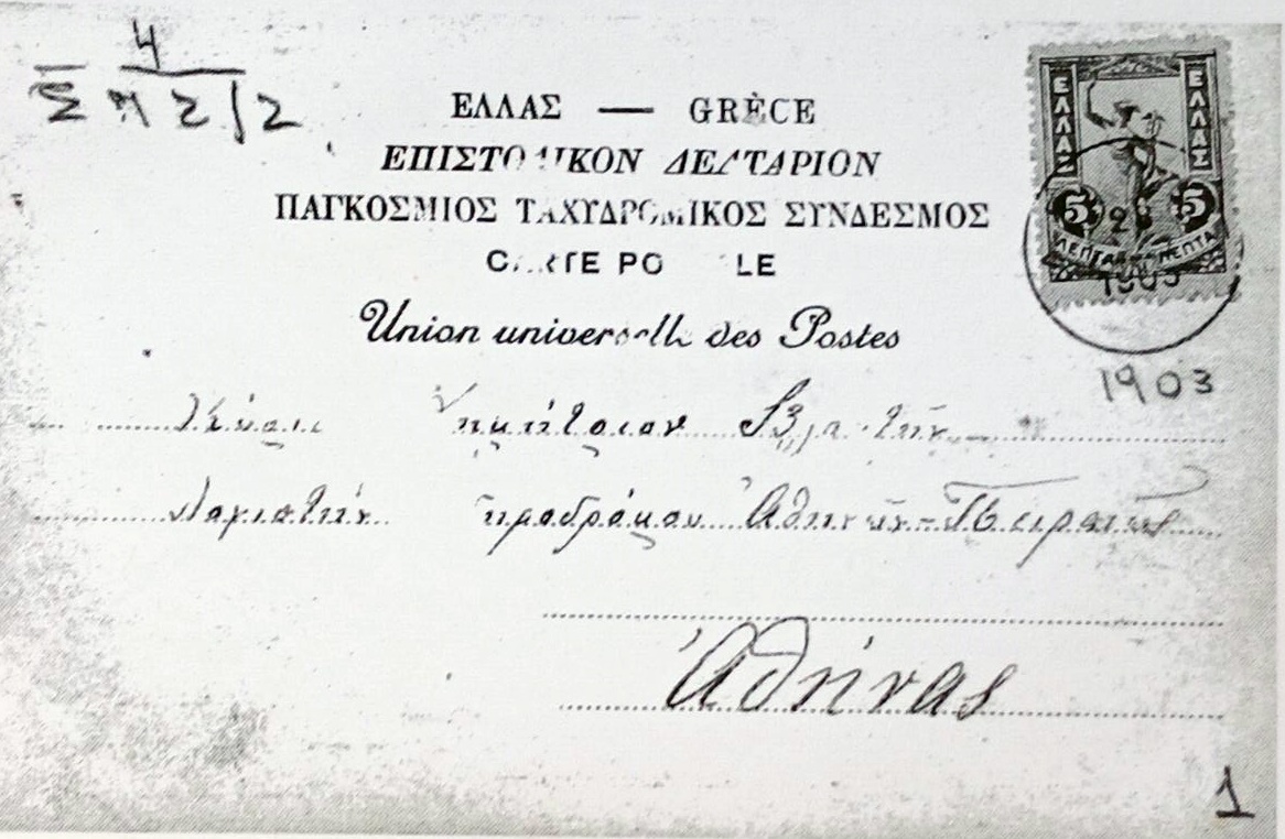 Το επιστολικό δελτάριο κυκλοφόρησε στις αρχές του 20ου αιώνα (1903). Αποστέλλεται από τη Λευκάδα στην Αθήνα, στον κ. Δημήτριο Βλαντή, που, όπως αναγράφεται, ήταν λογιστής του Σιδηρόδρομου Αθηνών-Πειραιώς, που κατασκευάστηκε το 1869 και ένωνε το Θησείο με τον Πειραιά.