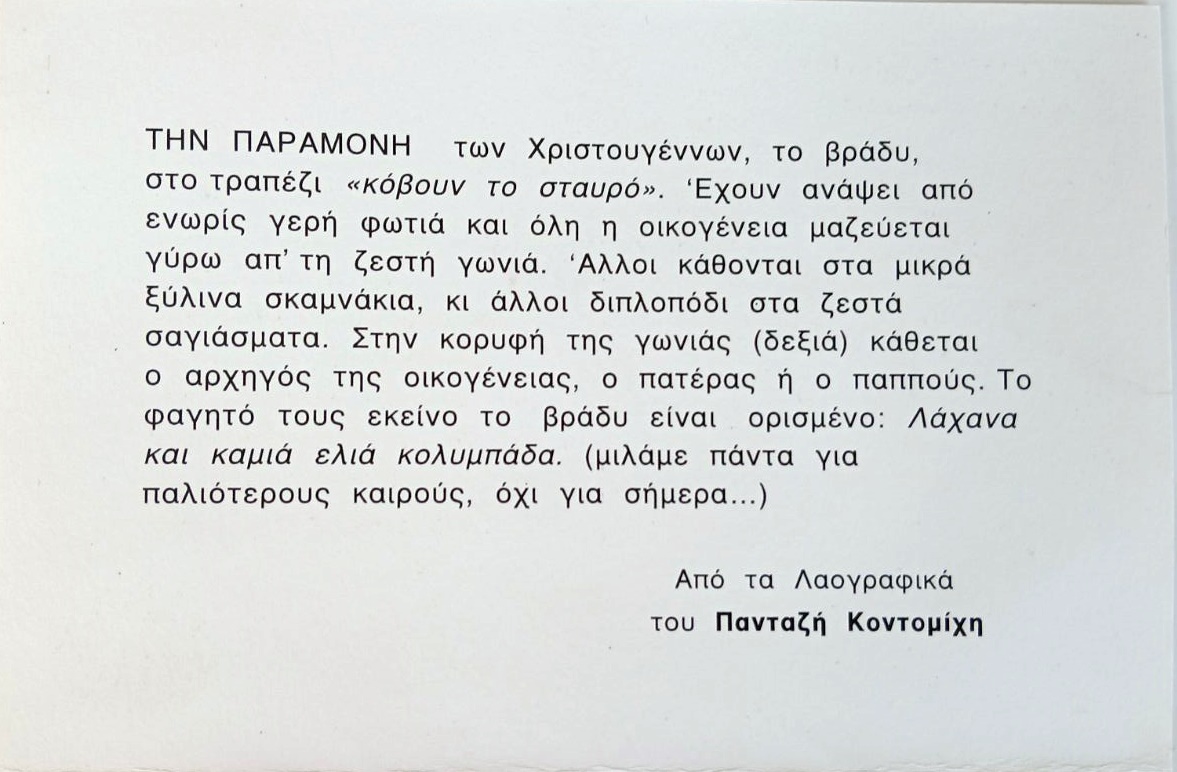 «ΤΗΝ ΠΑΡΑΜΟΝΗ των Χριστουγέννων, το βράδυ, στο τραπέζι «κόβουν το σταυρό». Έχουν ανάψει από ενωρίς γερή φωτιά και όλη η οικογένεια μαζεύεται γύρω απ΄ τη ζεστή γωνιά. Άλλοι κάθονται στα μικρά ξύλινα σκαμνάκια, κι άλλοι διπλοπόδι στα ζεστά σαγιάσματα. Στην κορυφή της γωνιάς (δεξιά) κάθεται ο αρχηγός της οικογένειας, ο πατέρας ή ο παππούς. Το φαγητό τους εκείνο το βράδυ είναι ορισμένο: Λάχανα και καμιά ελιά κολυμπάδα. (Μιλάμε πάντα για παλιότερους καιρούς, όχι για σήμερα)». (Σημ.: Το έθιμο αυτό με το κόψιμο του σταυρού, ψωμιού δηλαδή σε σχήμα σταυρού, το θυμάμαι να γίνεται πάνω σε μια μπουκάλα με κρασί στη μέση του τραπεζιού. Για το φαγητό που αναφέρεται δεν το θυμάμαι. Ίσα ίσα είχαμε μάλλον καλό φαγητό).
