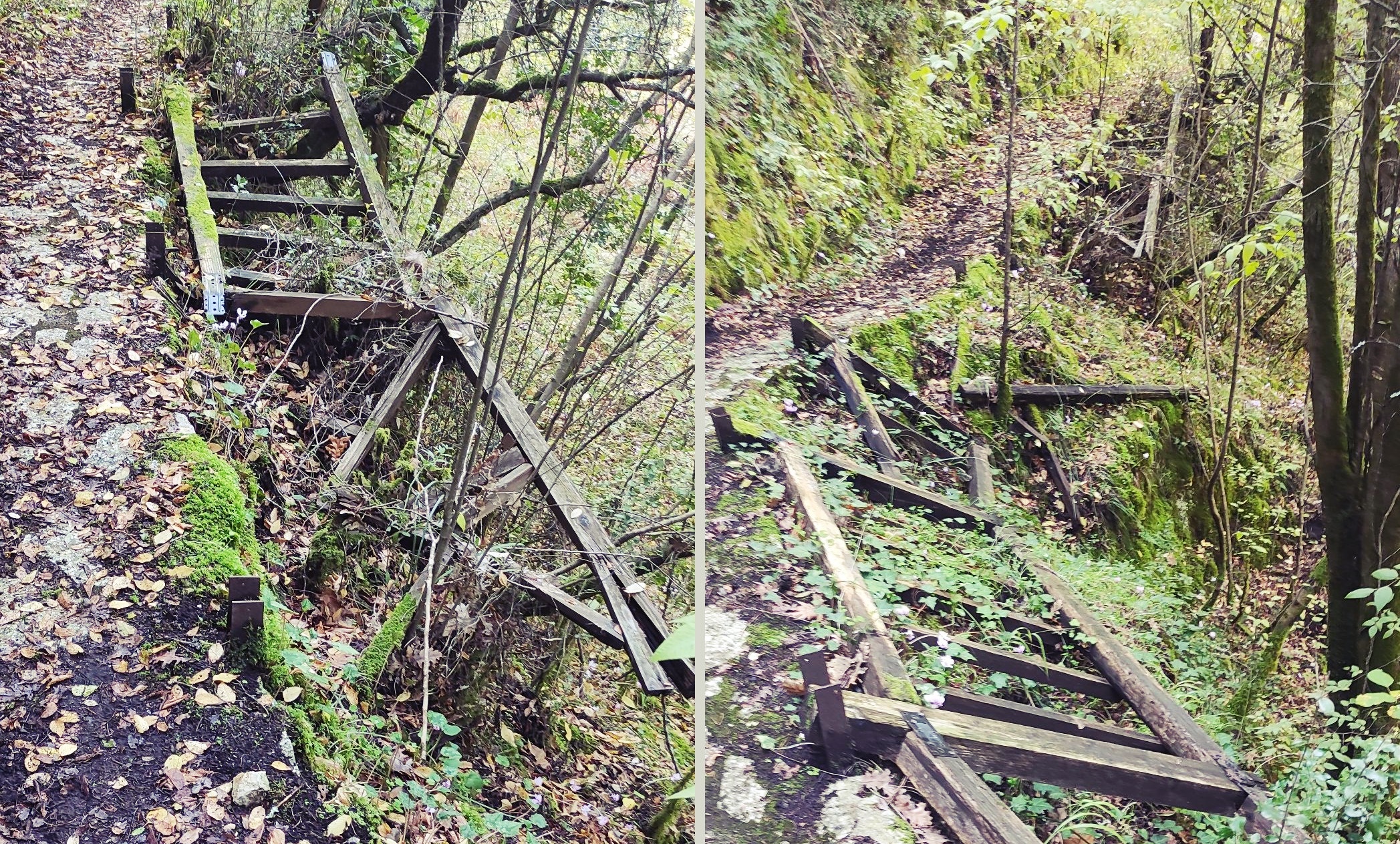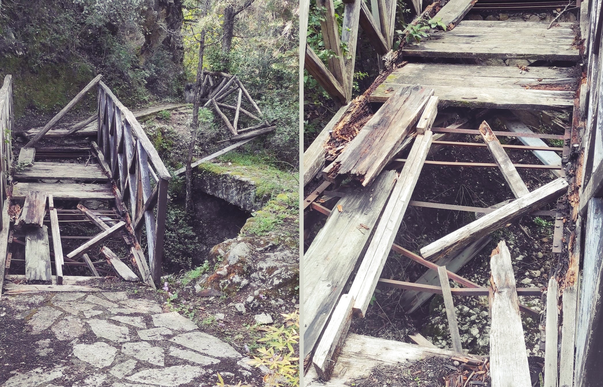 Έχουμε κι εμείς στο παρελθόν επισκεφθεί την περιοχή και έχουμε διαπιστώσει από κοντά την κατάσταση που επικρατεί, όμως αυτή τη φορά -όπως δείχνουν οι φωτογραφίες- η φθορά και η εγκατάλειψη ξεπερνούν κάθε φαντασία. Τα ξύλινα προστατευτικά κάγκελα που υπήρχαν κάποτε κατά μήκος των μονοπατιών είναι σπασμένα και πεσμένα προς τις κοίτες του φαραγγιού. Πολλά σκαλοπάτια των ξύλινων γεφυριών βρίσκονται σαπισμένα, σπασμένα και κάποια από αυτά απουσιάζουν εντελώς…